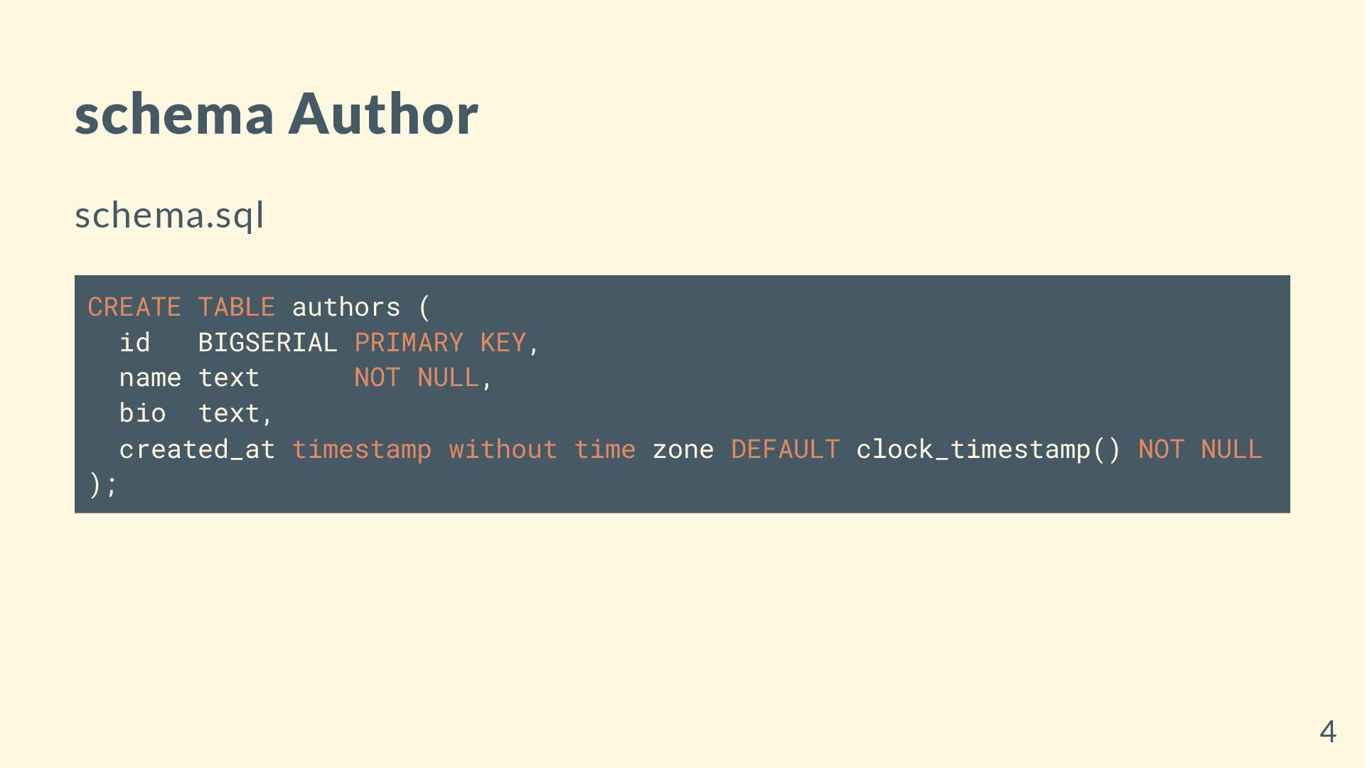 KEY, name text NOT NULL, bio text, created_at timestamp without time zone DEFAULT clock_timestamp() NOT NULL ); 4
