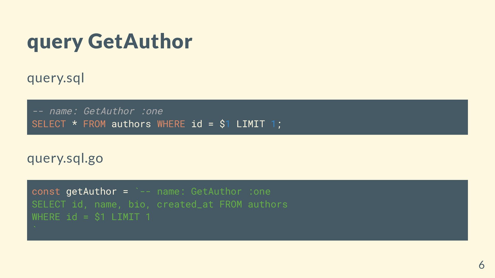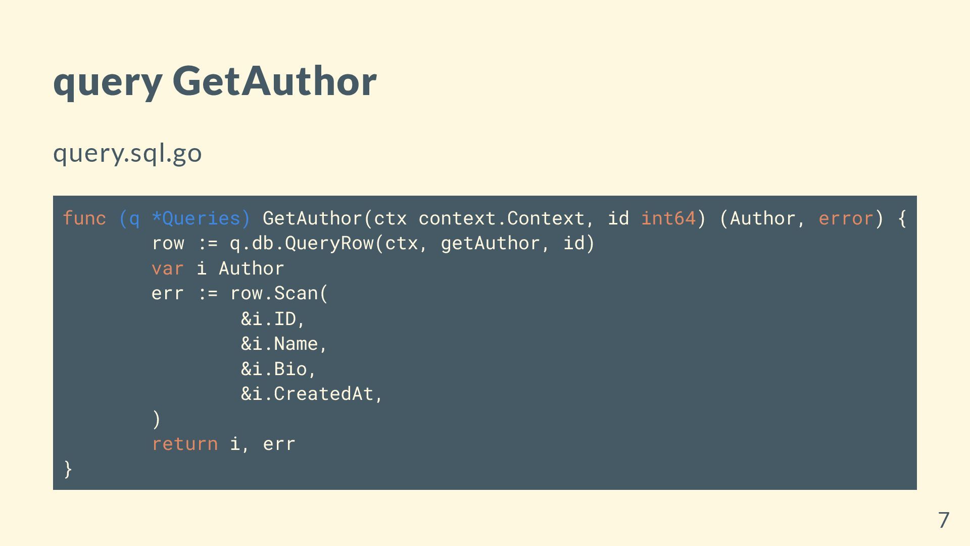 authors WHERE id = $1 LIMIT 1; query.sql.go const getAuthor = `-- name: GetAuthor :one SELECT id, name, bio, created_at FROM authors WHERE id = $1 LIMIT 1 ` 6