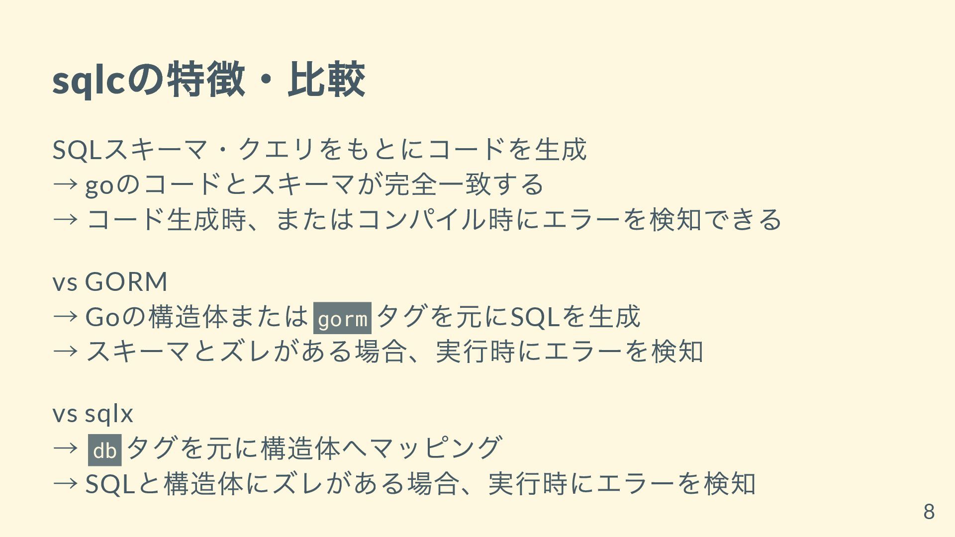 GORM → Go の構造体または gorm タグを元にSQL を生成 → スキーマとズレがある場合、実行時にエラーを検知 vs sqlx → db タグを元に構造体へマッピング → SQL と構造体にズレがある場合、実行時にエラーを検知 8