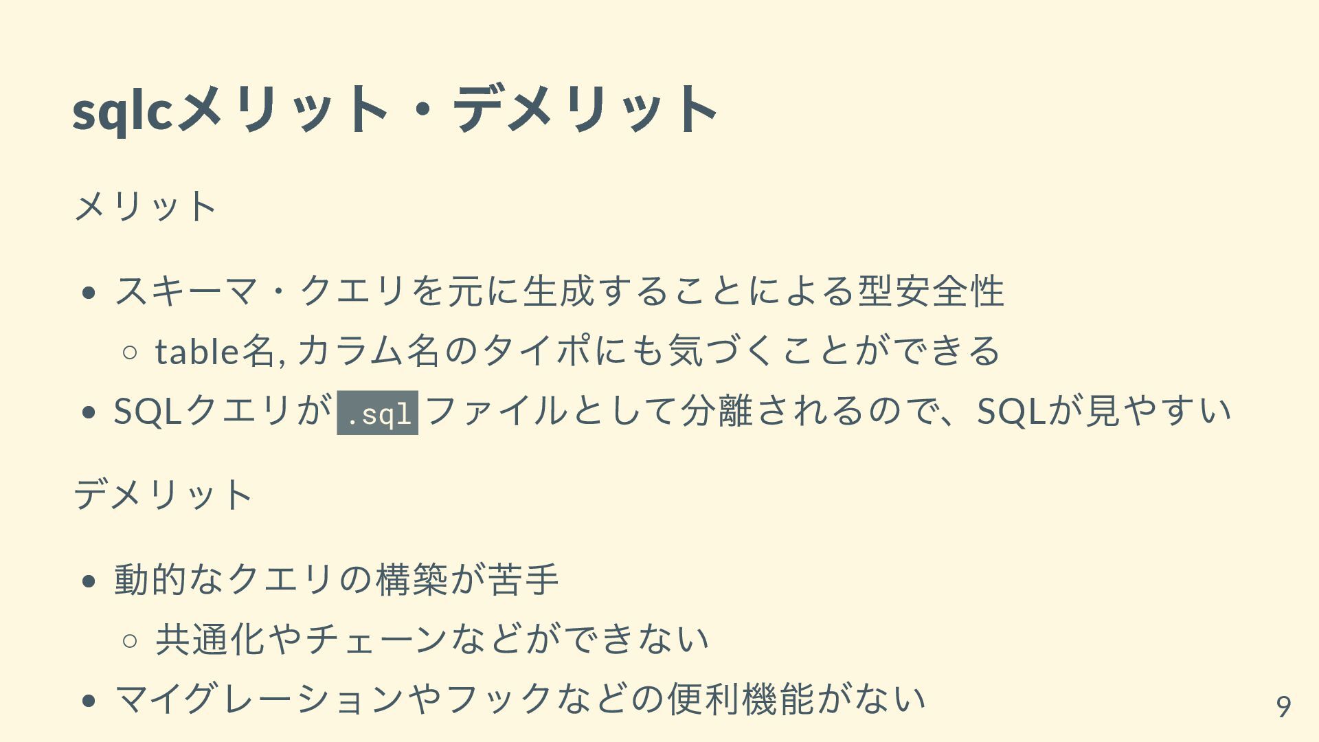 sqlc メリット・デメリット メリット スキーマ・クエリを元に生成することによる型安全性 table 名, カラム名のタイポにも気づくことができる SQL クエリが .sql
