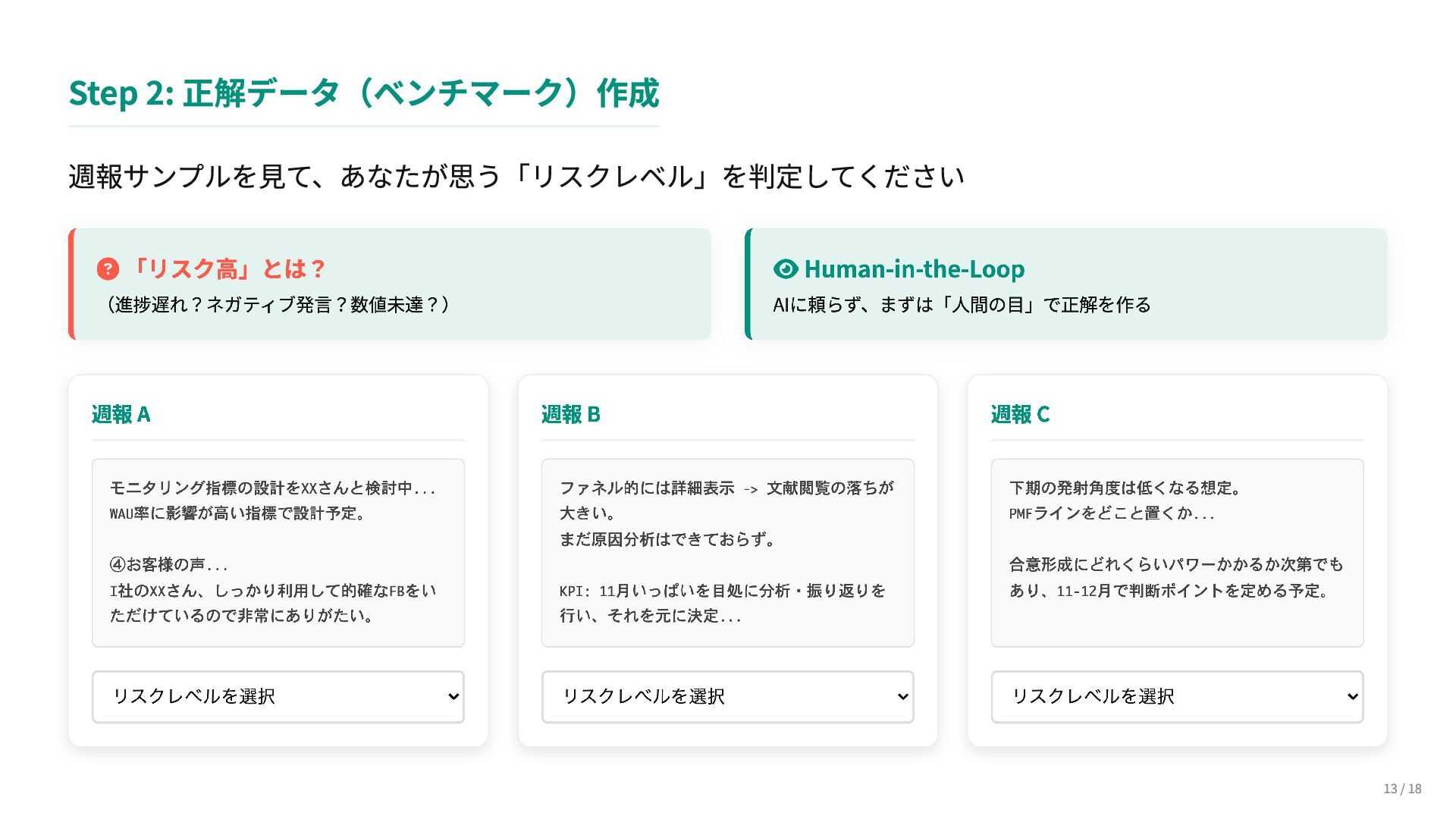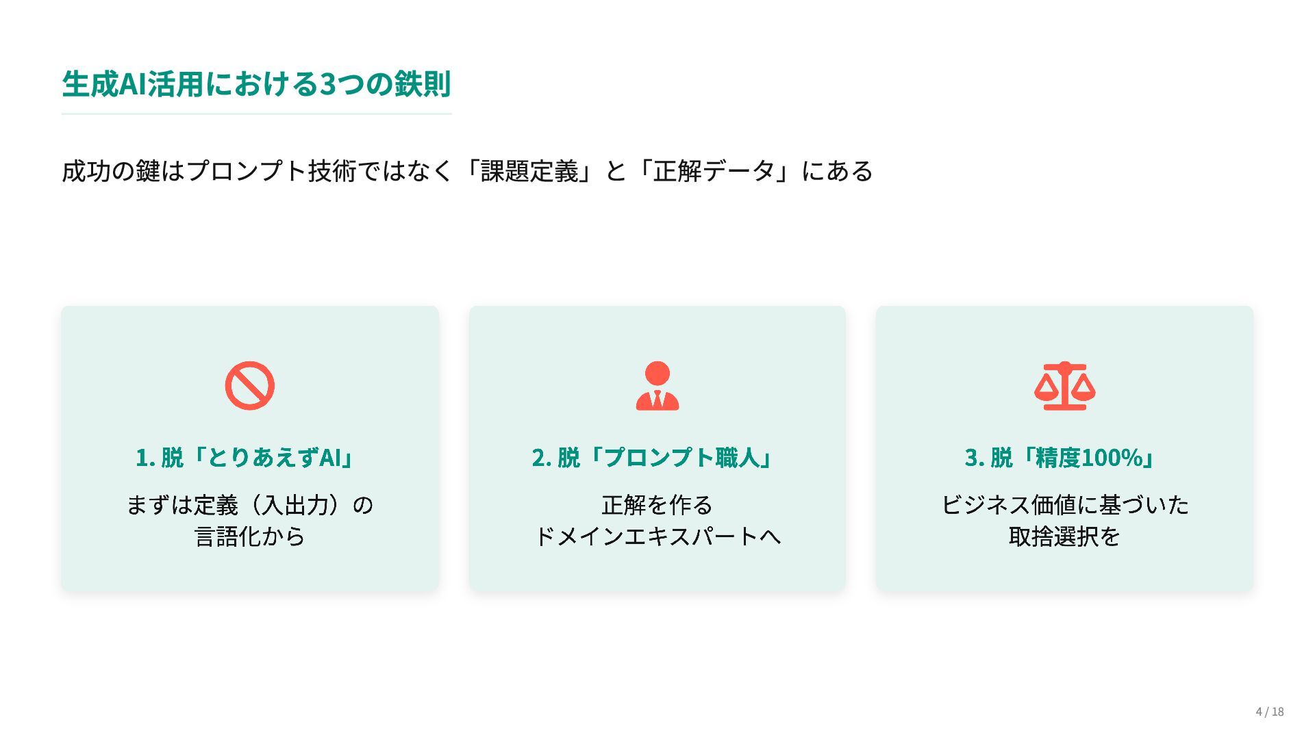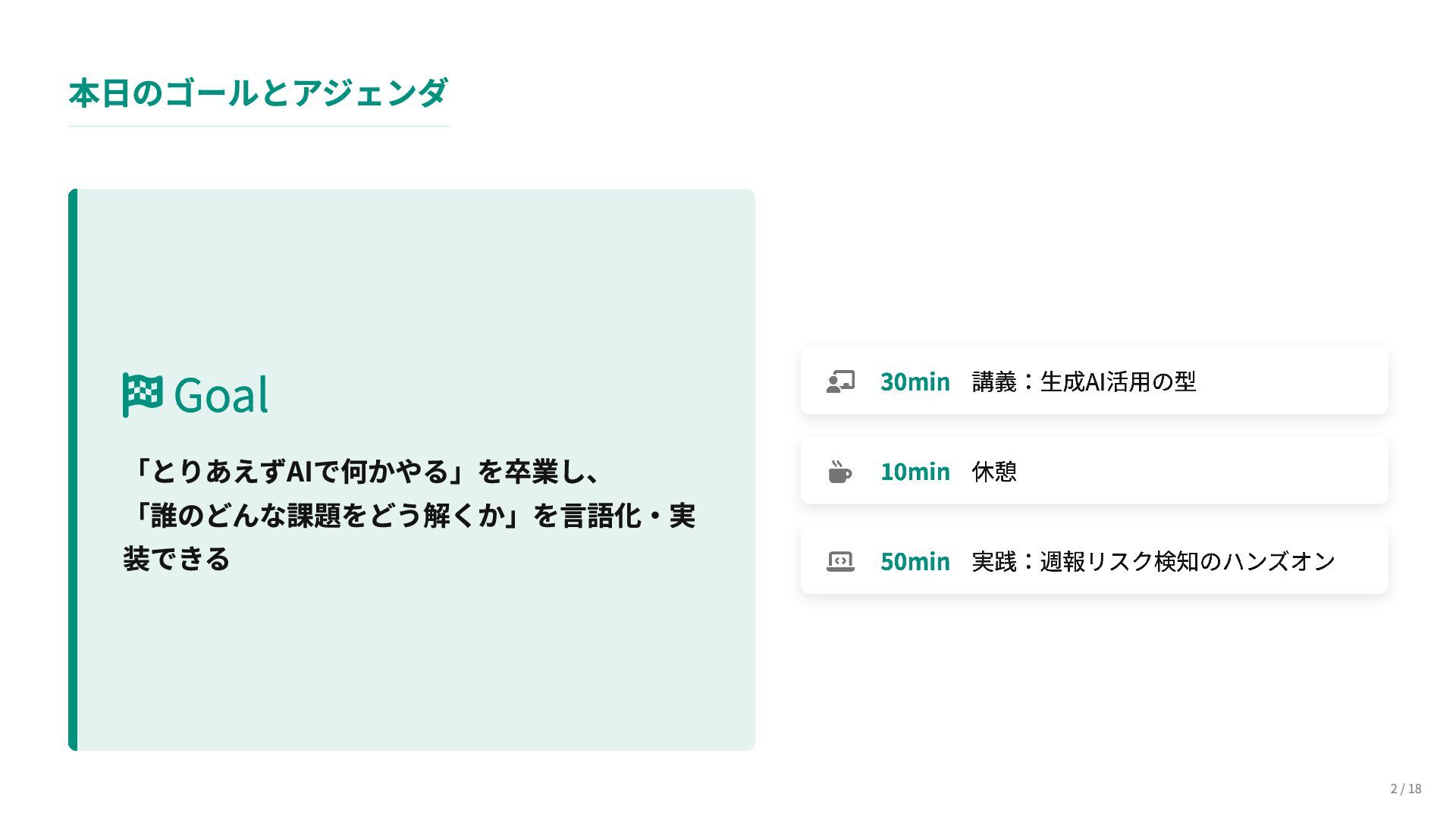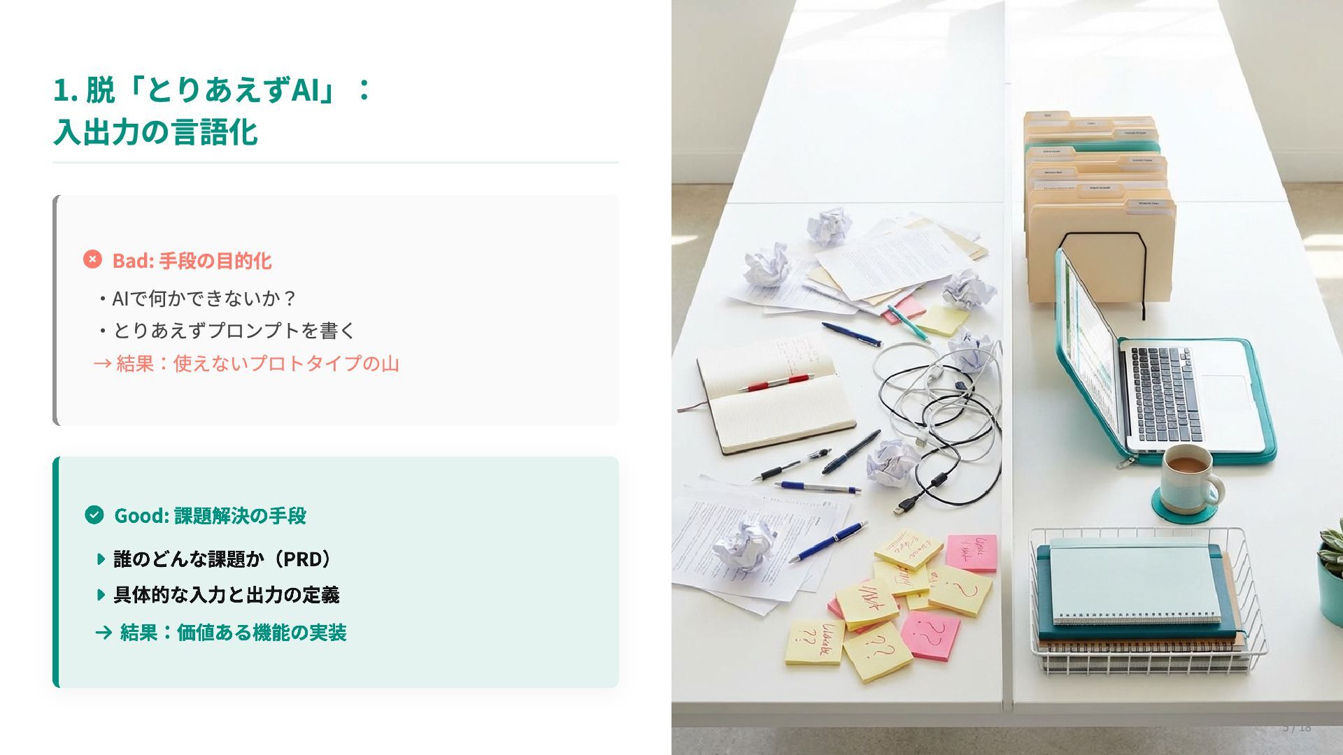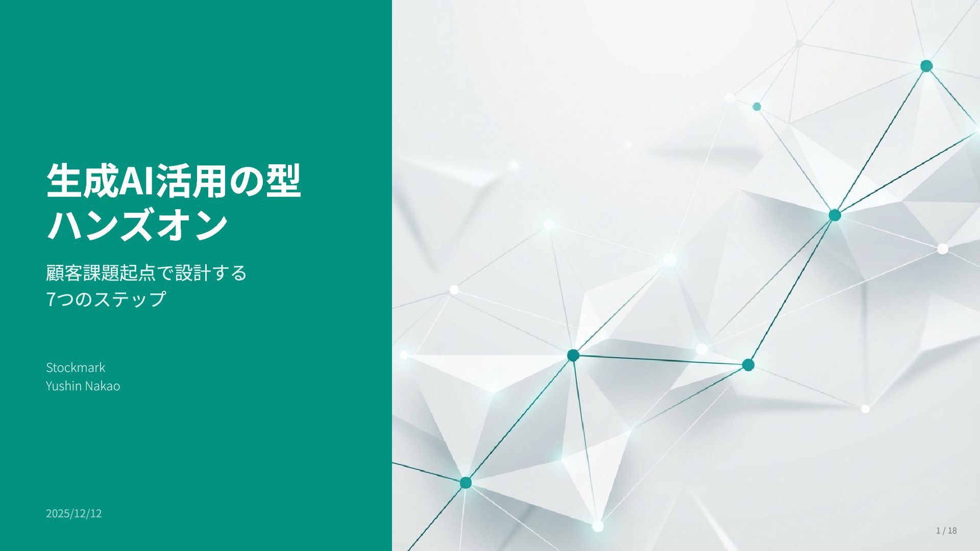 ストックマークの社内勉強会で用いたスライドです。テーマは「とりあえずAIで何かやるを卒業し、誰のどんな課題をどう解くかを言語化・実装する」です。スライドのレイアウトと画像はGemini 3 ProとNano Bananaで生成しました。