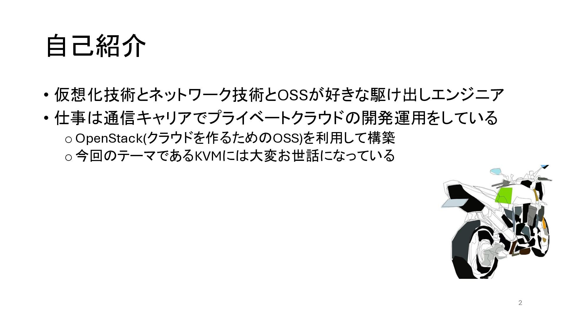 自己紹介 • 仮想化技術とネットワーク技術とOSSが好きな駆け出しエンジニア • 仕事は通信キャリアでプライベートクラウドの開発運用をしている oOpenStack(クラウドを作るためのOSS)を利用して構築 o 今回のテーマであるKVMには大変お世話になっている 2