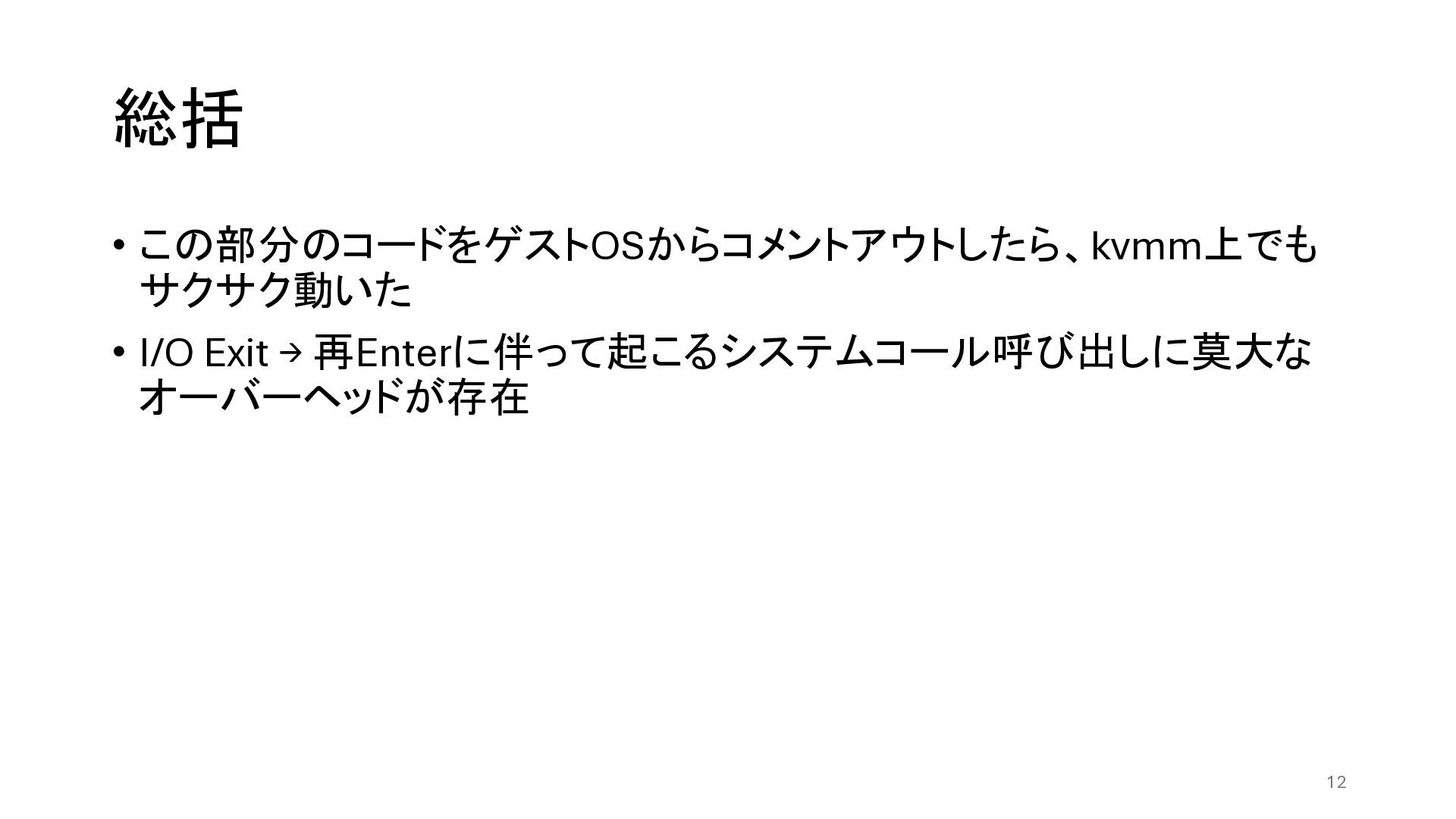 総括 • この部分のコードをゲストOSからコメントアウトしたら、kvmm上でも サクサク動いた • I/O Exit → 再Enterに伴って起こるシステムコール呼び出しに莫大な オーバーヘッドが存在