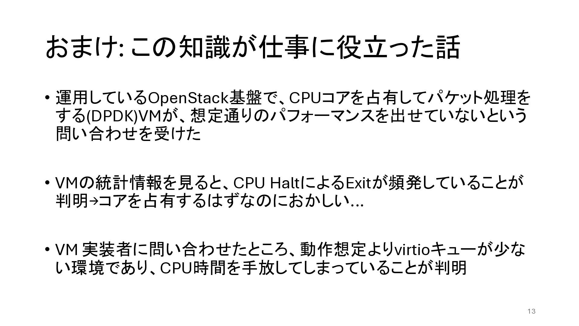 おまけ: この知識が仕事に役立った話 • 運用しているOpenStack基盤で、CPUコアを占有してパケット処理を する(DPDK)VMが、想定通りのパフォーマンスを出せていないという 問い合わせを受けた • VMの統計情報を見ると、CPU HaltによるExitが頻発していることが 判明→コアを占有するはずなのにおかしい...