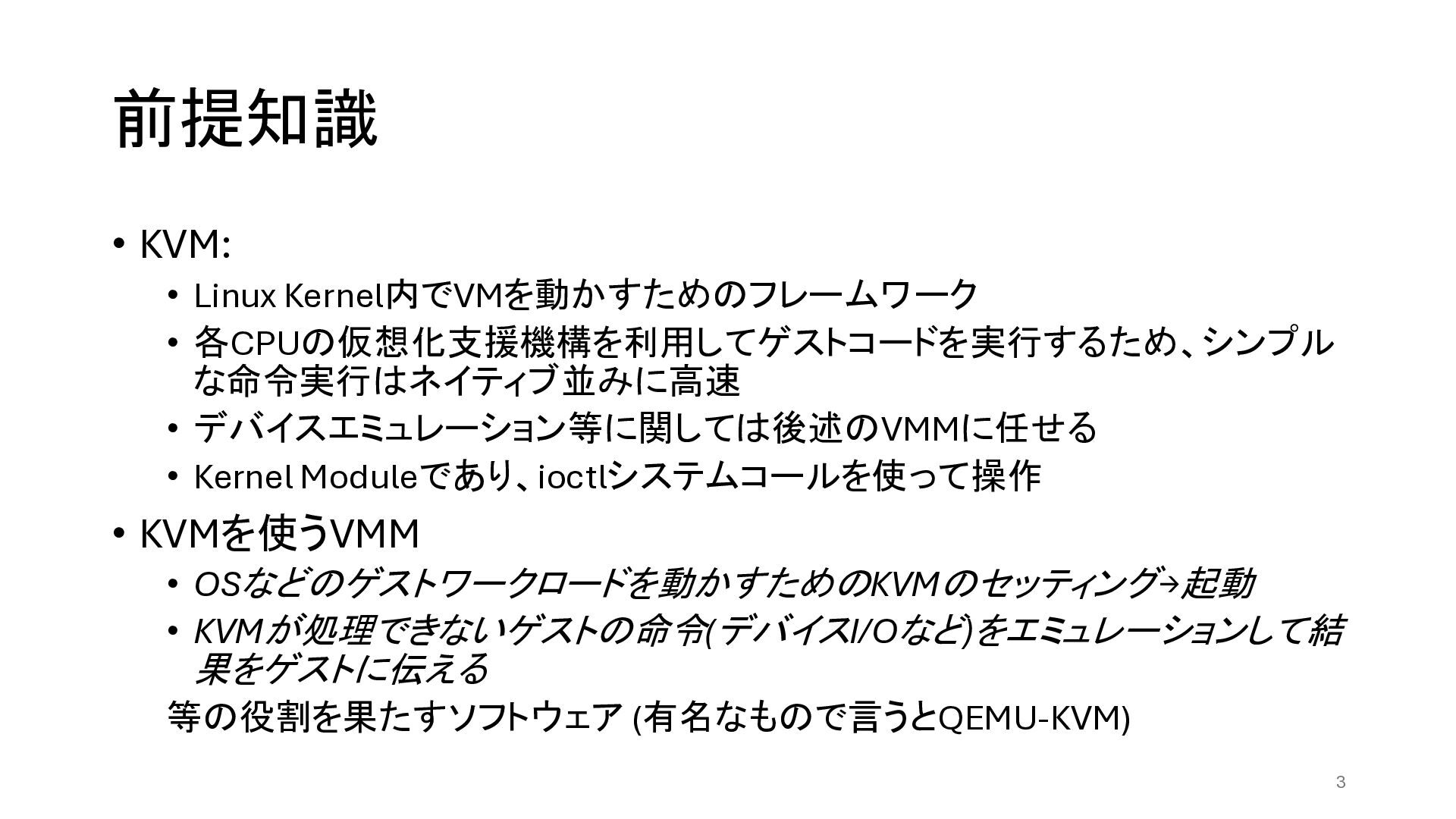 前提知識 • KVM: • Linux Kernel内でVMを動かすためのフレームワーク • 各CPUの仮想化支援機構を利用してゲストコードを実行するため、シンプル な命令実行はネイティブ並みに高速 •