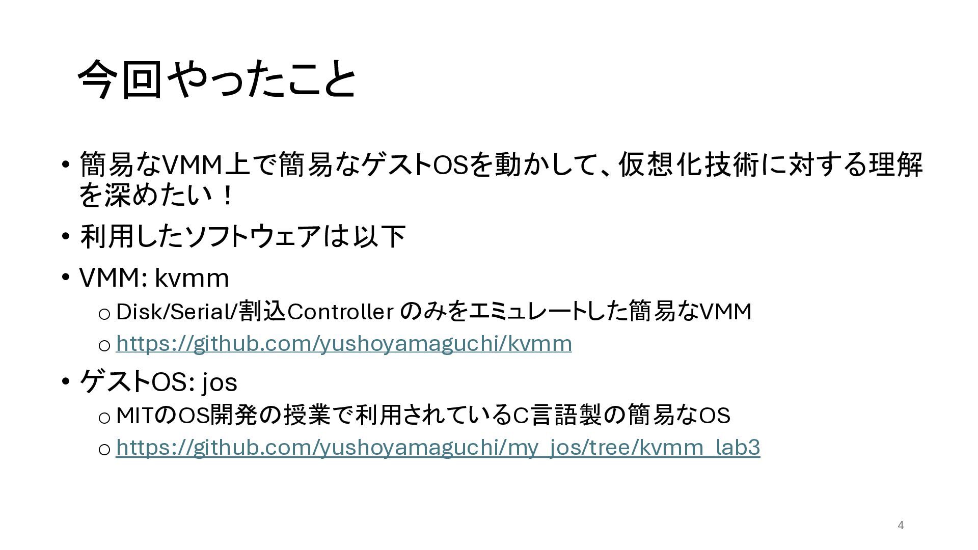のみをエミュレートした簡易なVMM ohttps://github.com/yushoyamaguchi/kvmm • ゲストOS: jos oMITのOS開発の授業で利用されているC言語製の簡易なOS ohttps://github.com/yushoyamaguchi/my_jos/tree/kvmm_lab3 4