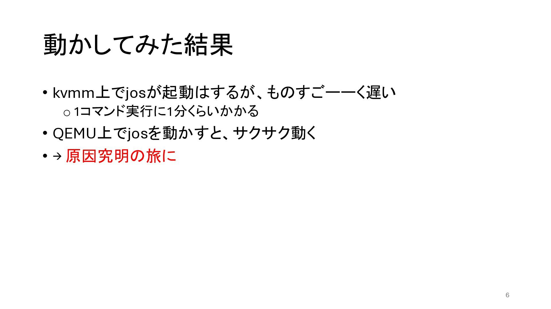 動かしてみた結果 • kvmm上でjosが起動はするが、ものすごーーく遅い o1コマンド実行に1分くらいかかる • QEMU上でjosを動かすと、サクサク動く • → 原因究明の旅に 6