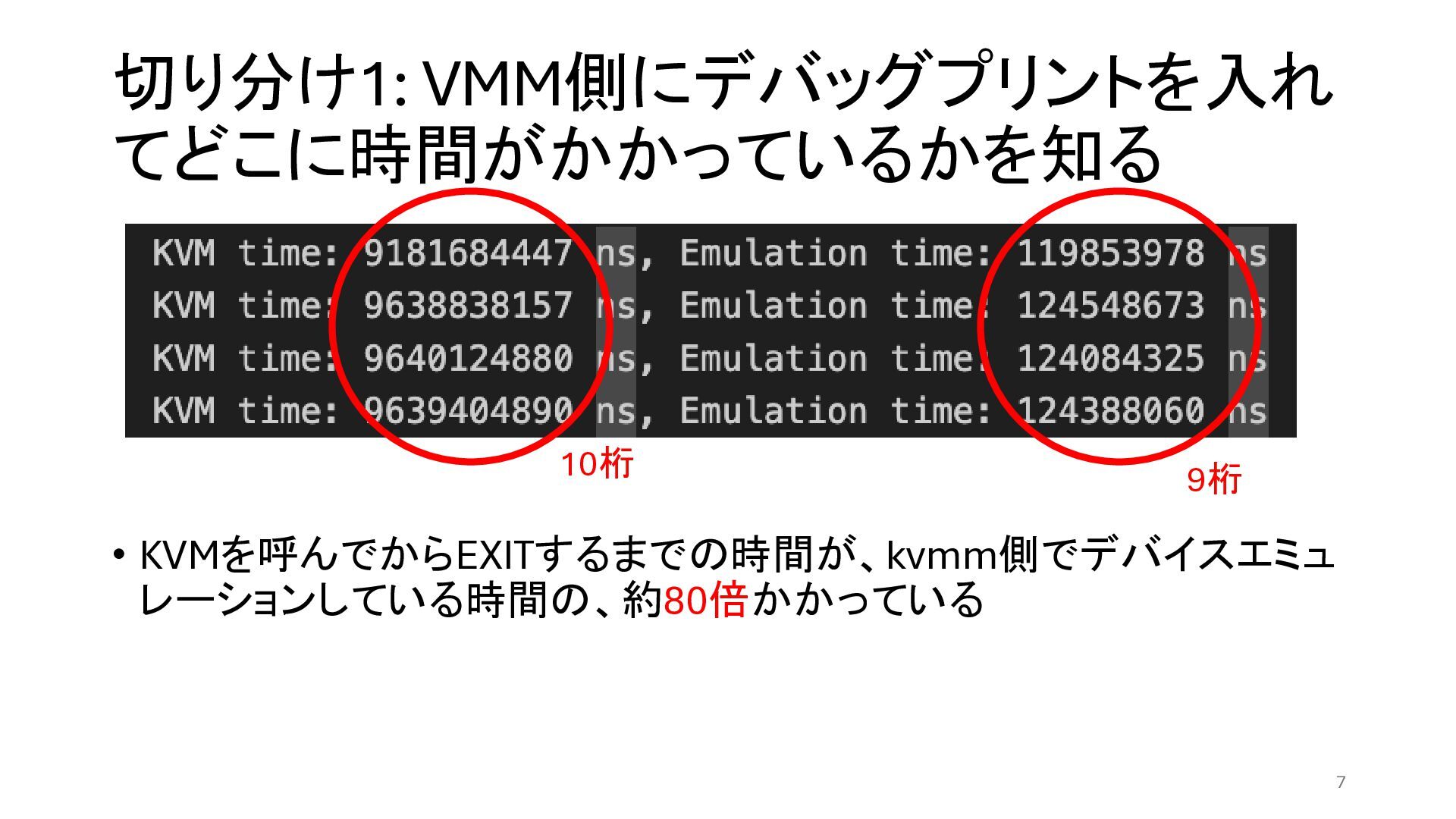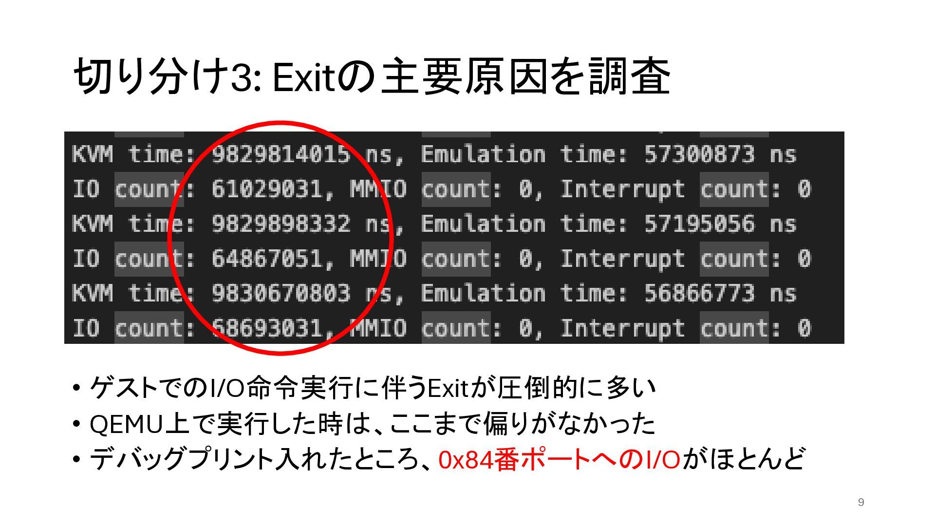 切り分け1: VMM側にデバッグプリントを入れ てどこに時間がかかっているかを知る • KVMを呼んでからEXITするまでの時間が、kvmm側でデバイスエミュ レーションしている時間の、約80倍かかっている 7 10桁 9桁