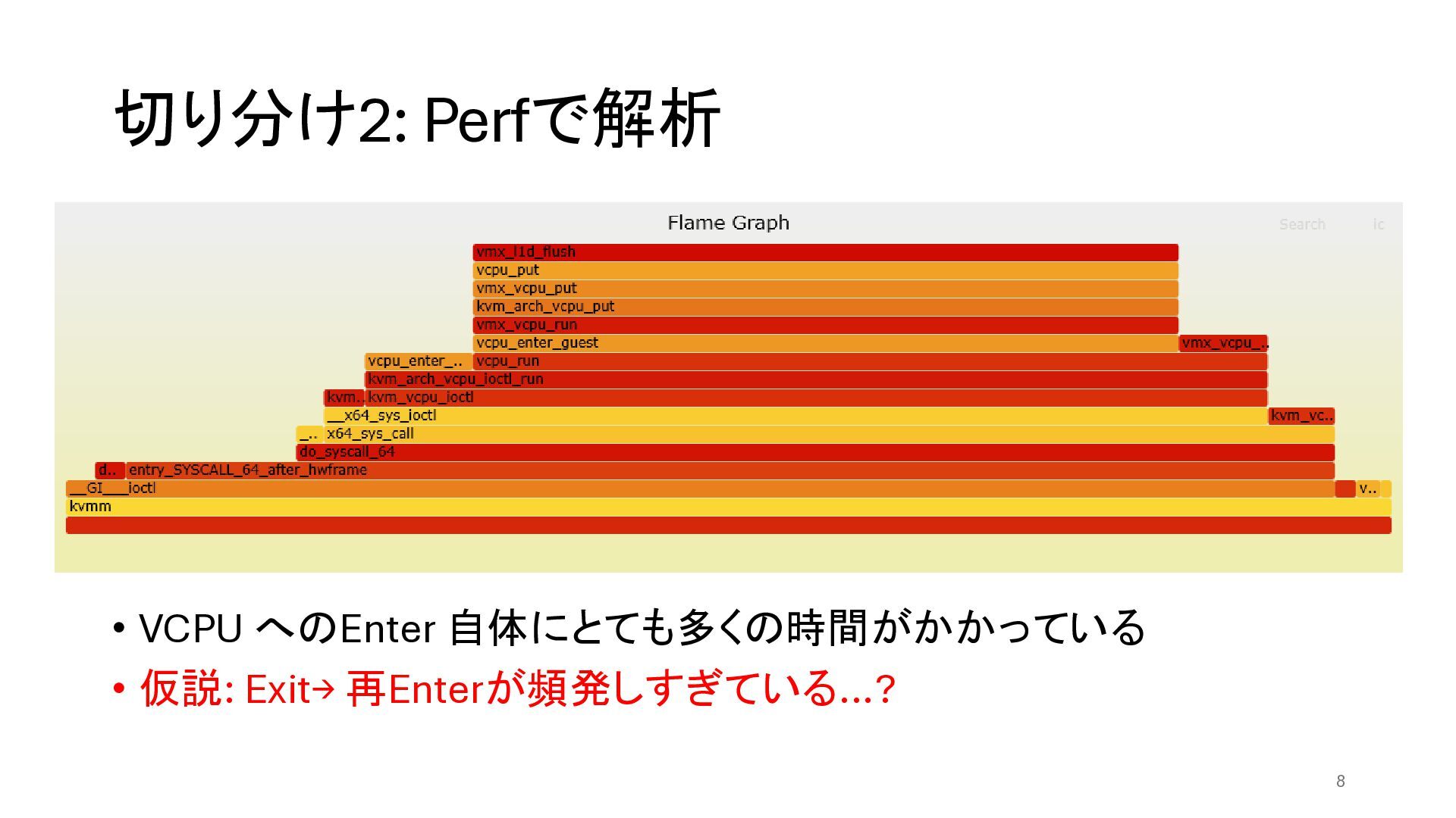 切り分け2: Perfで解析 • VCPU へのEnter 自体にとても多くの時間がかかっている • 仮説: Exit→ 再Enterが頻発しすぎている...?