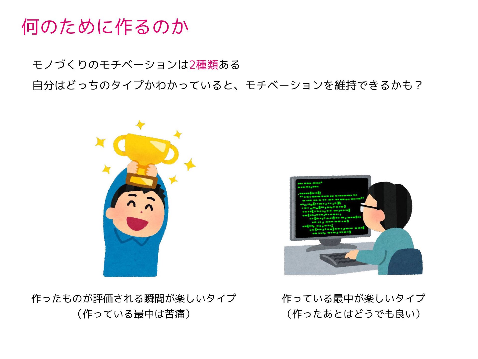 モノづくりのモチベーションは2種類ある 作ったものが評価される瞬間が楽しいタイプ (作っている最中は苦痛) 作っている最中が楽しいタイプ (作ったあとはどうでも良い) 自分はどっちのタイプかわかっていると、モチベーションを維持できるかも? 何のために作るのか
