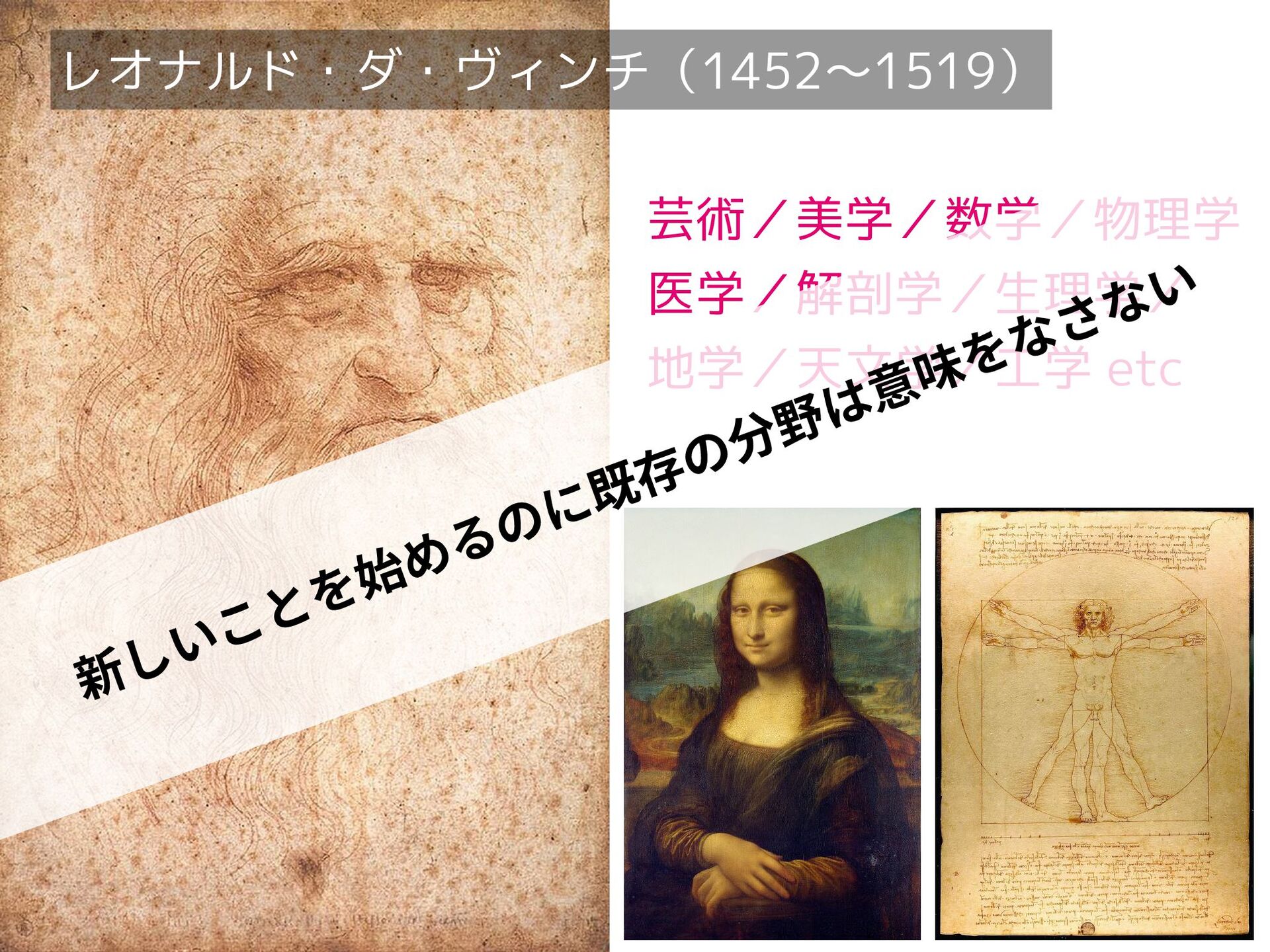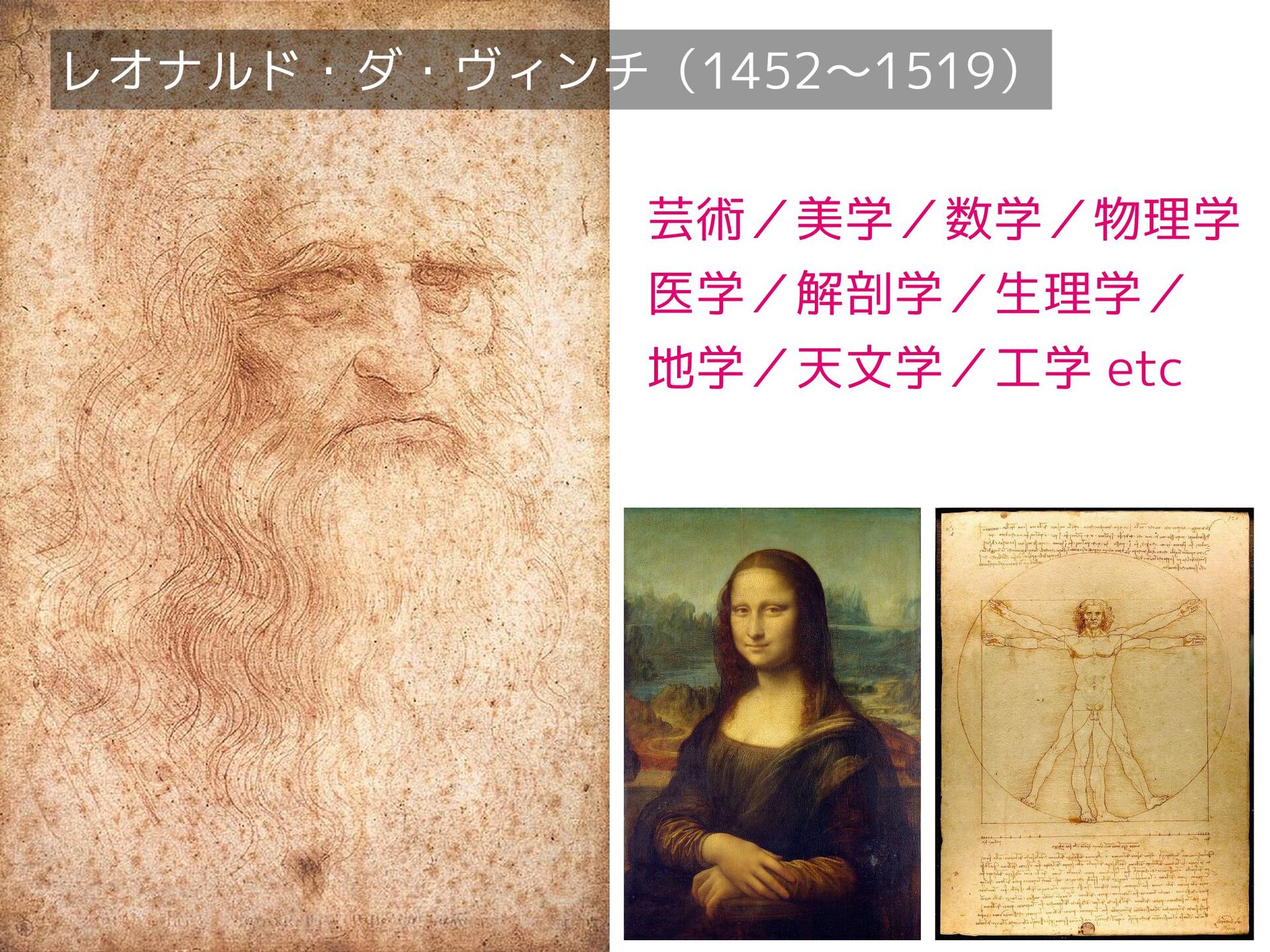 レオナルド・ダ・ヴィンチ(1452〜1519) 芸術/美学/数学/物理学 医学/解剖学/生理学/ 地学/天文学/工学 etc 新しいことを始めるのに既存の分野は意味をなさない