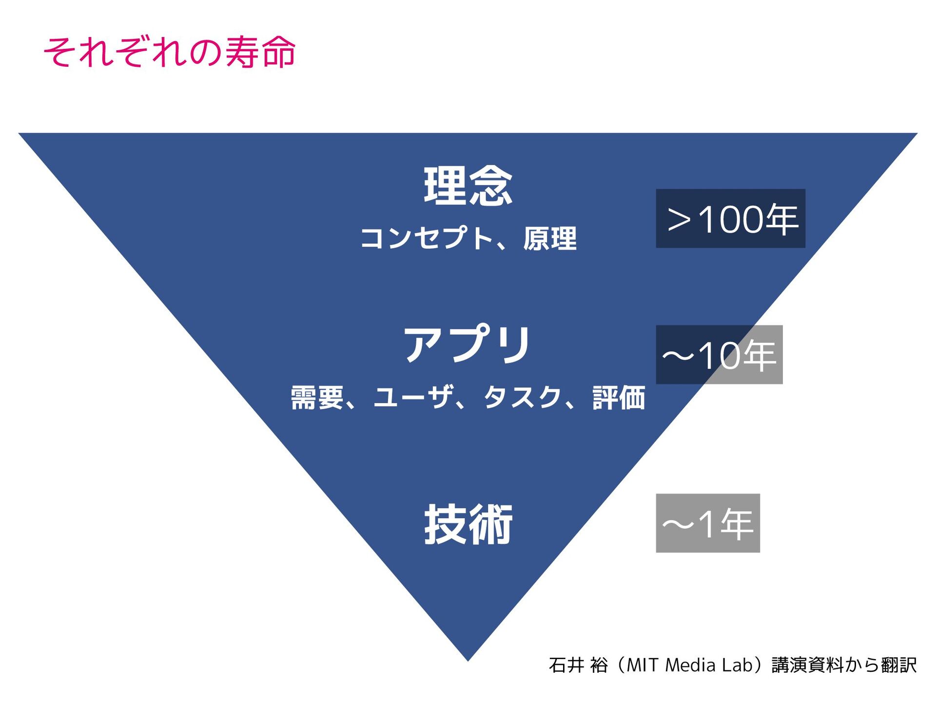 それぞれの寿命 理念 コンセプト、原理 アプリ 需要、ユーザ、タスク、評価 技術 >100年 〜10年 〜1年 石井