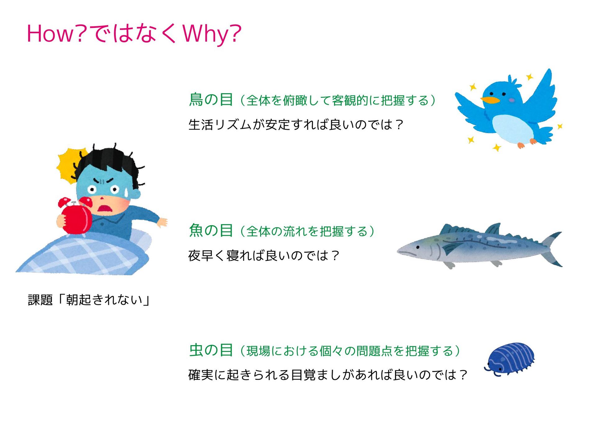How?ではなくWhy? 課題「朝起きれない」 鳥の目(全体を俯瞰して客観的に把握する) 生活リズムが安定すれば良いのでは? 魚の目(全体の流れを把握する) 夜早く寝れば良いのでは? 虫の目(現場における個々の問題点を把握する) 確実に起きられる目覚ましがあれば良いのでは?