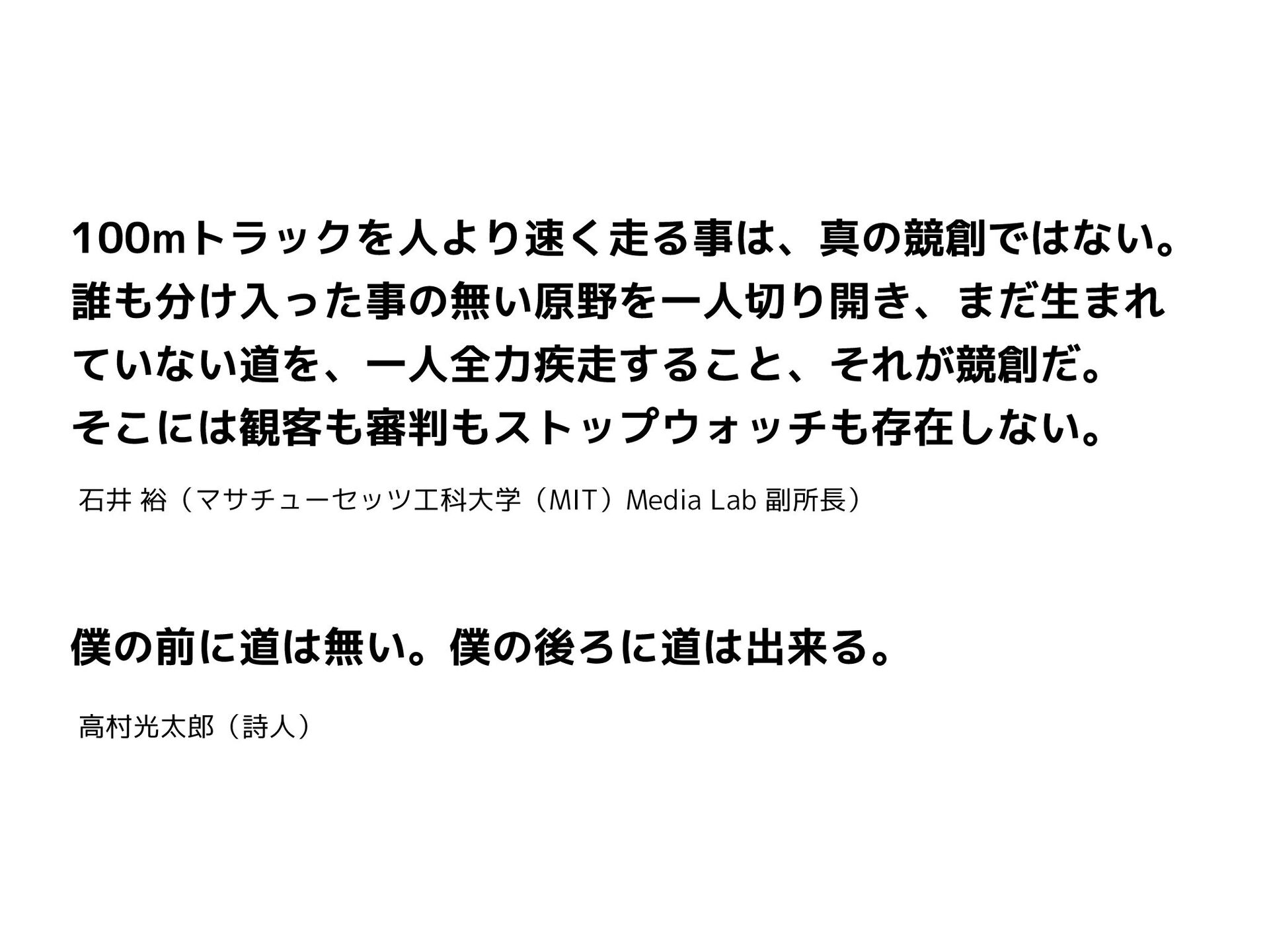 100mトラックを人より速く走る事は、真の競創ではない。 誰も分け入った事の無い原野を一人切り開き、まだ生まれ ていない道を、一人全力疾走すること、それが競創だ。 そこには観客も審判もストップウォッチも存在しない。 石井 裕(マサチューセッツ工科大学(MIT)Media Lab 副所長) 僕の前に道は無い。僕の後ろに道は出来る。 高村光太郎(詩人)