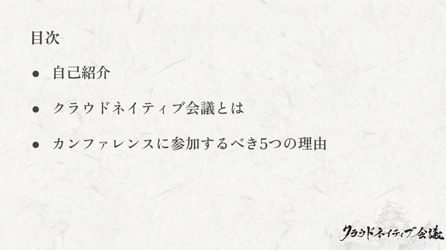 目次 • 自己紹介 • クラウドネイティブ会議とは • カンファレンスに参加するべき5つの理由