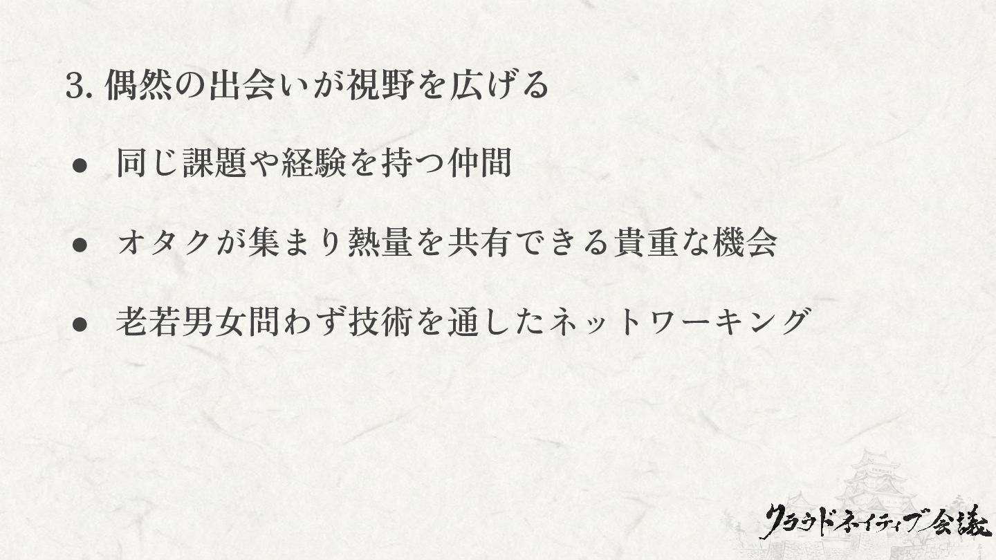 3. 偶然の出会いが視野を広げる • 同じ課題や経験を持つ仲間 • オタクが集まり熱量を共有できる貴重な機会 • 老若男女問わず技術を通したネットワーキング