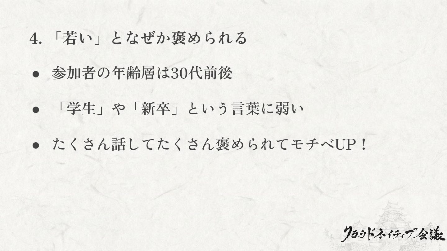 4. 「若い」となぜか褒められる • 参加者の年齢層は30代前後 • 「学生」や「新卒」という言葉に弱い • たくさん話してたくさん褒められてモチベUP!
