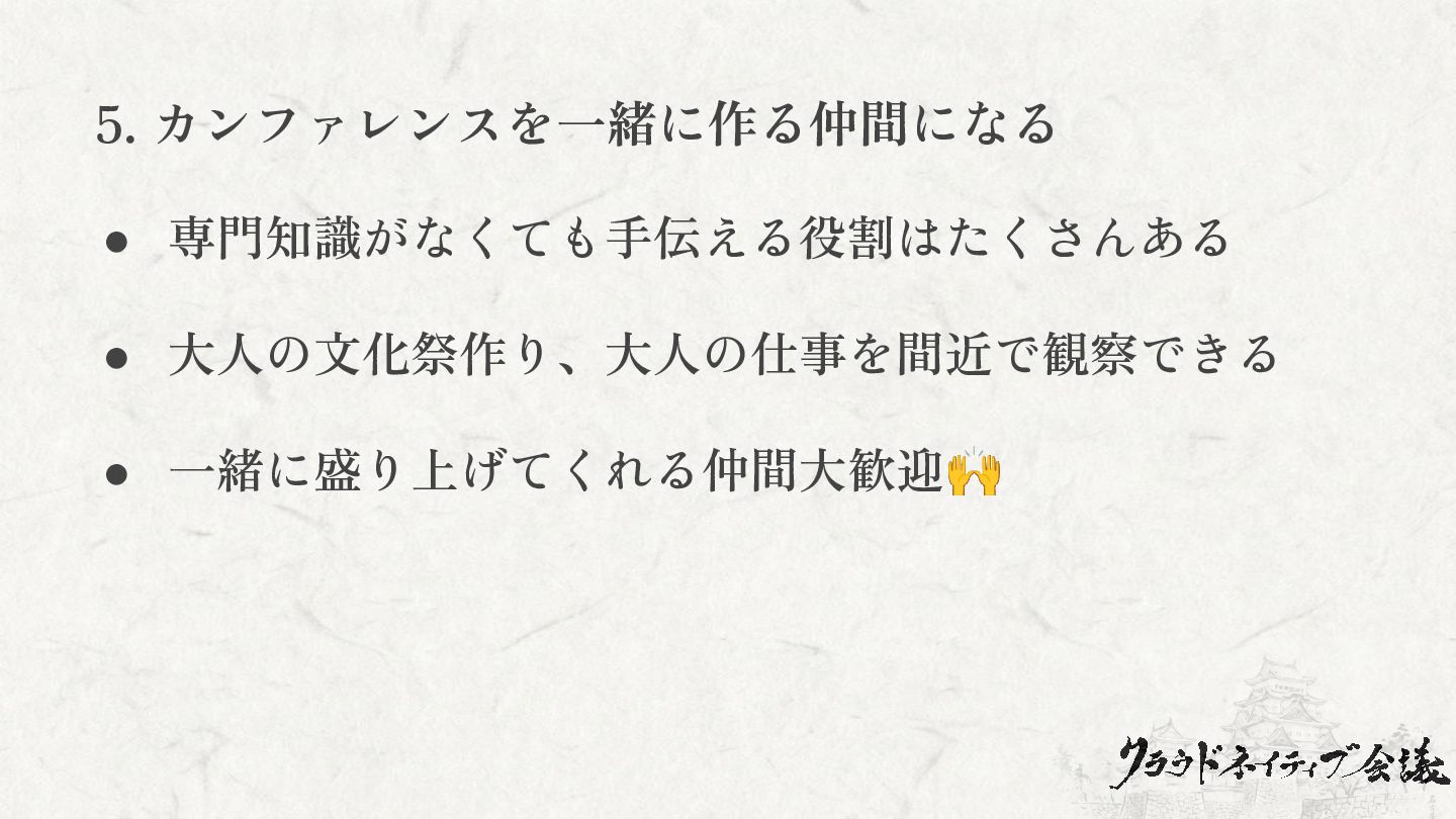 5. カンファレンスを一緒に作る仲間になる • 専門知識がなくても手伝える役割はたくさんある • 大人の文化祭作り、大人の仕事を間近で観察できる • 一緒に盛り上げてくれる仲間大歓迎🙌