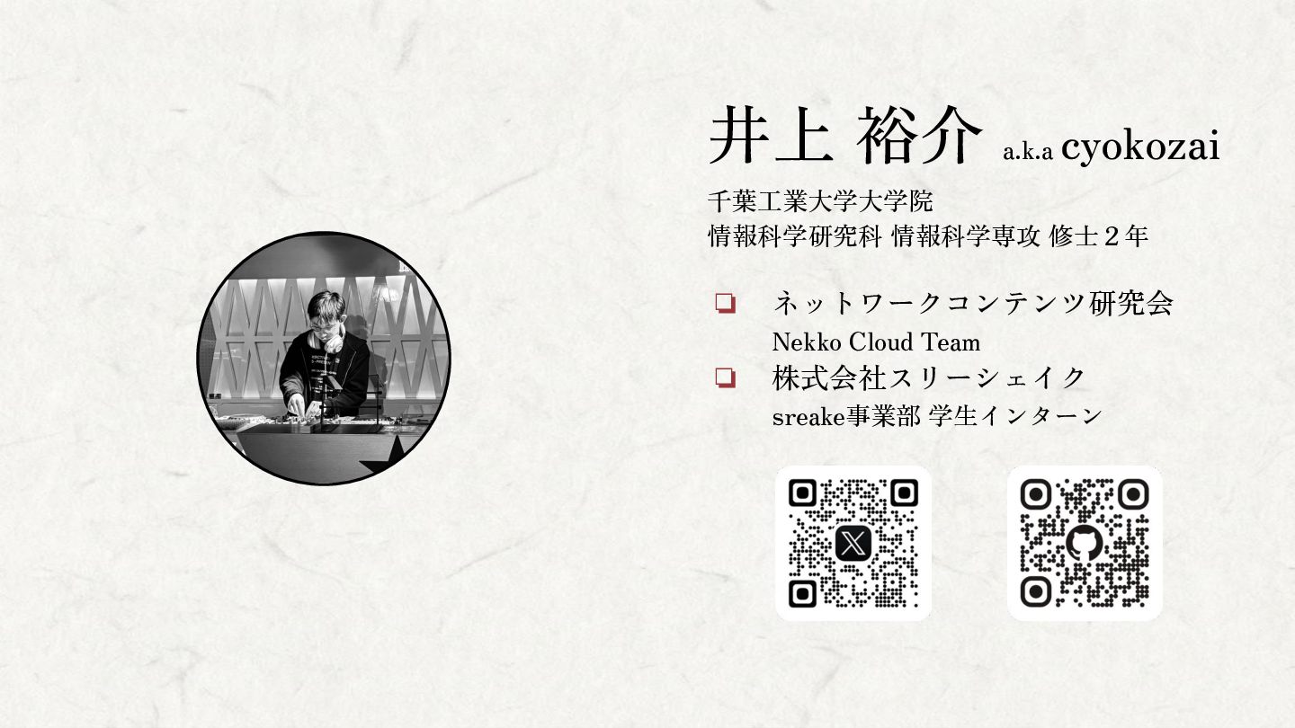 井上 裕介 a.k.a cyokozai 千葉工業大学大学院 情報科学研究科 情報科学専攻 修士2年 ❏ ネットワークコンテンツ研究会
