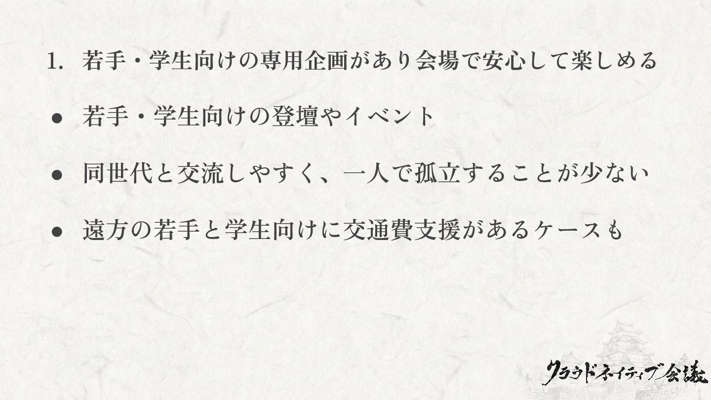1. 若手・学生向けの専用企画があり会場で安心して楽しめる • 若手・学生向けの登壇やイベント • 同世代と交流しやすく、一人で孤立することが少ない • 遠方の若手と学生向けに交通費支援があるケースも