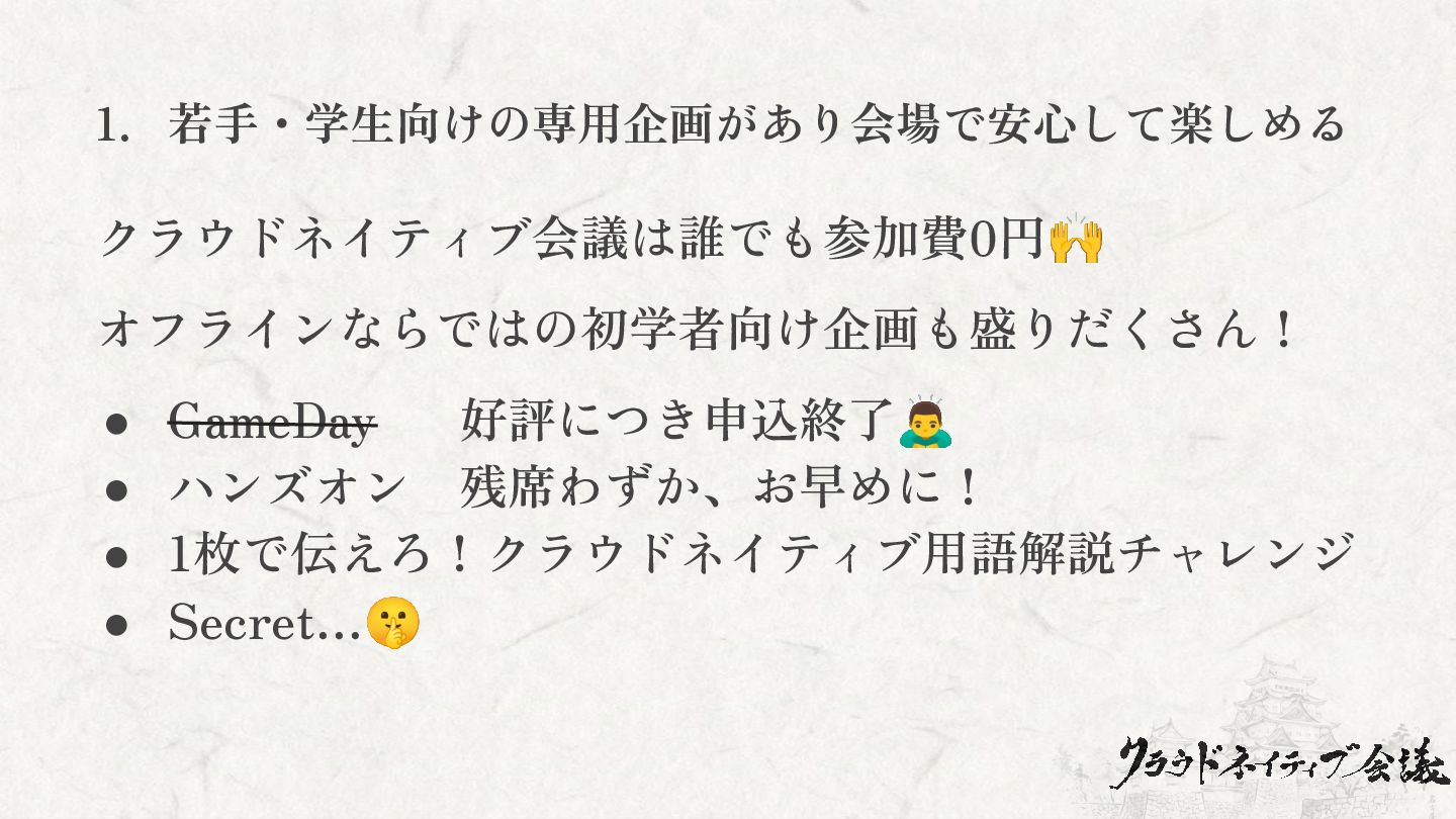 1. 若手・学生向けの専用企画があり会場で安心して楽しめる クラウドネイティブ会議は誰でも参加費0円🙌 オフラインならではの初学者向け企画も盛りだくさん! • GameDay 好評につき申込終了 • ハンズオン 残席わずか、お早めに!