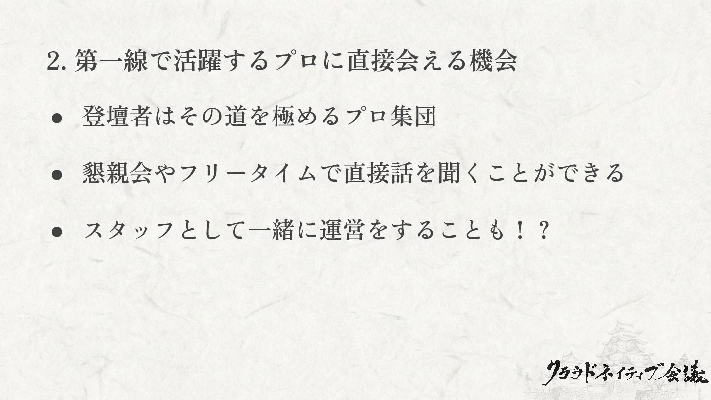 2. 第一線で活躍するプロに直接会える機会 • 登壇者はその道を極めるプロ集団 • 懇親会やフリータイムで直接話を聞くことができる • スタッフとして一緒に運営をすることも!?