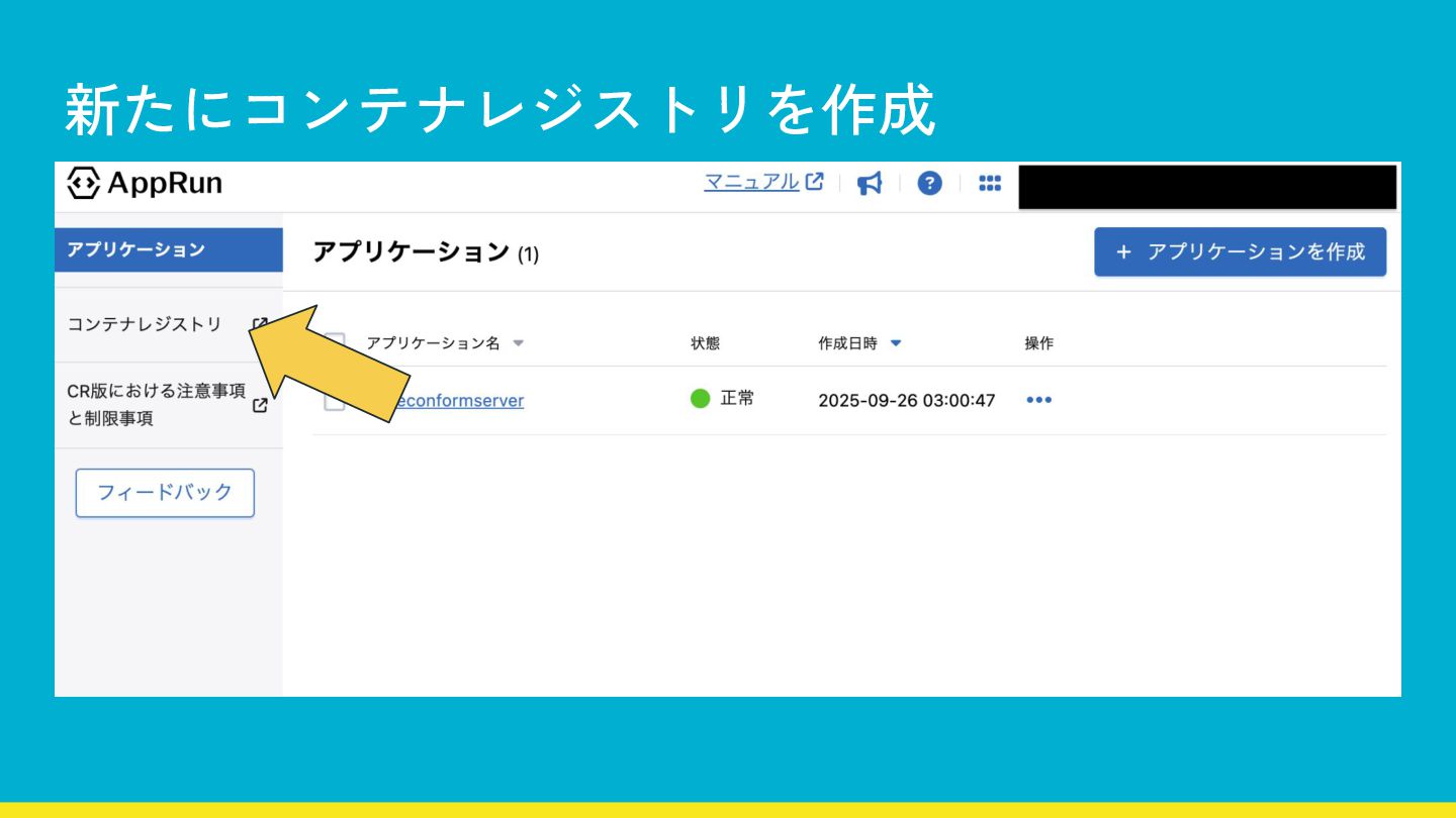 手動デプロイの手順 1. コンテナレジストリ作成 2. 使用するイメージをCRへ Push 3. アプリを作成 (GUI操作) 4.