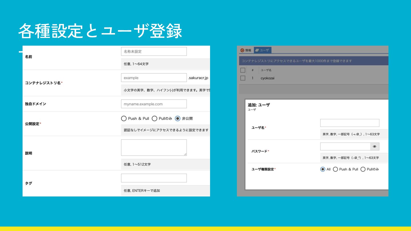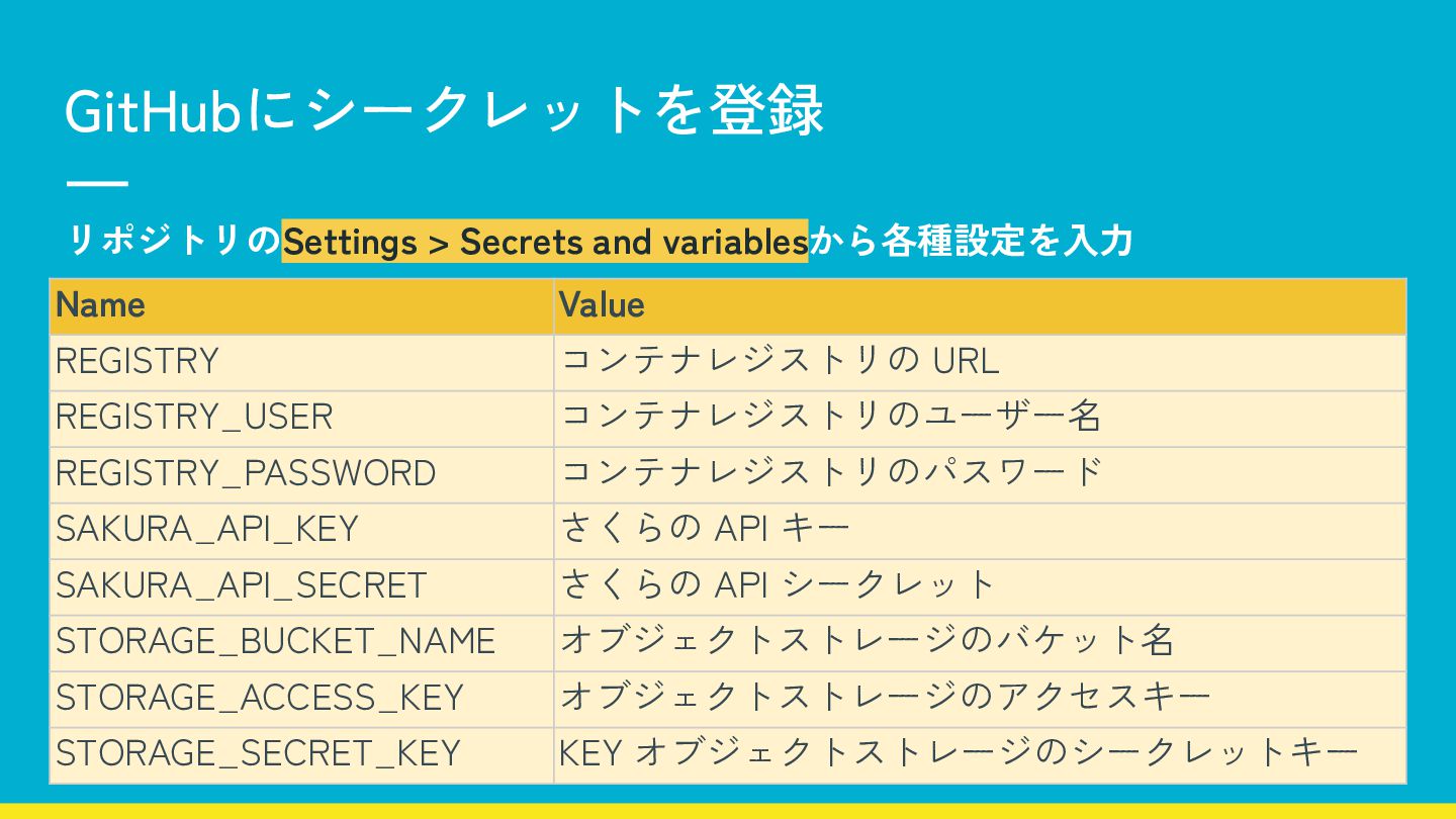 Name Value REGISTRY コンテナレジストリの URL REGISTRY_USER コンテナレジストリのユーザー名 REGISTRY_PASSWORD コンテナレジストリのパスワード SAKURA_API_KEY