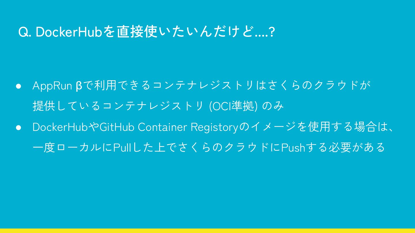 Q. DockerHubを直接使いたいんだけど....? • AppRun βで利用できるコンテナレジストリはさくらのクラウドが 提供しているコンテナレジストリ (OCI準拠) のみ • DockerHubやGitHub