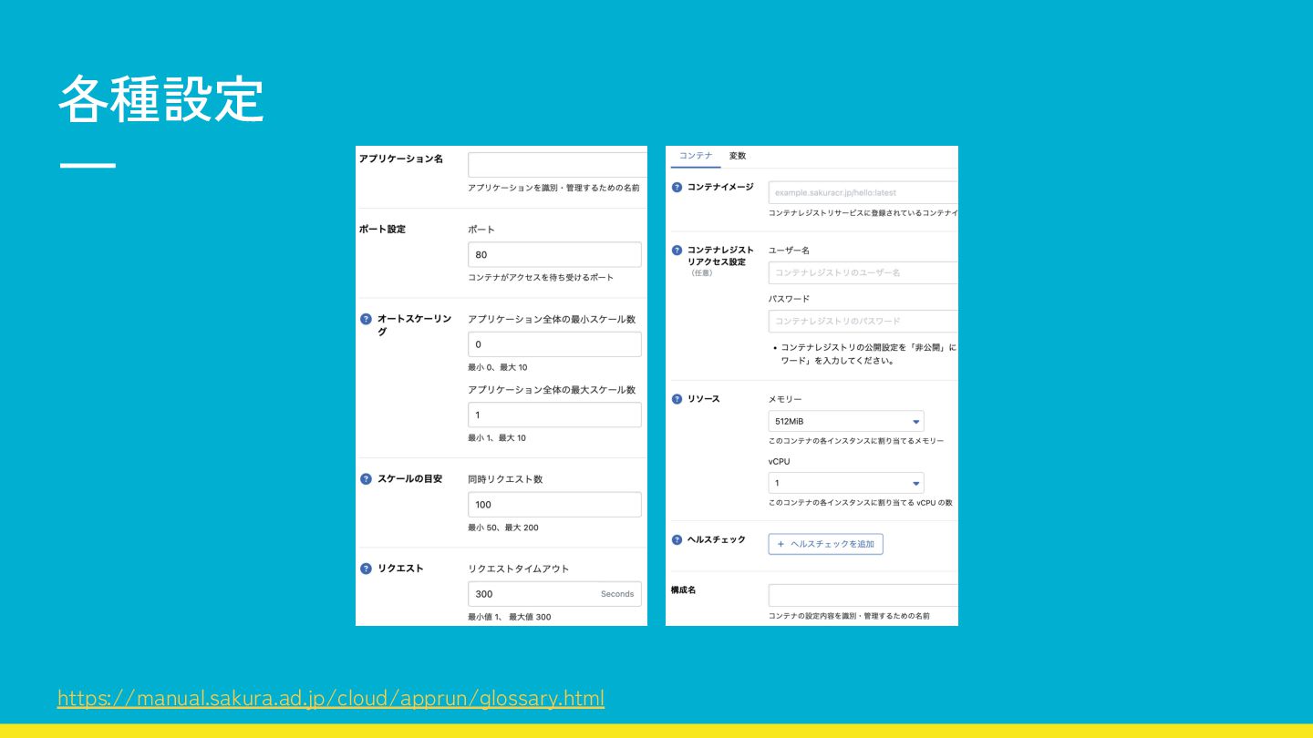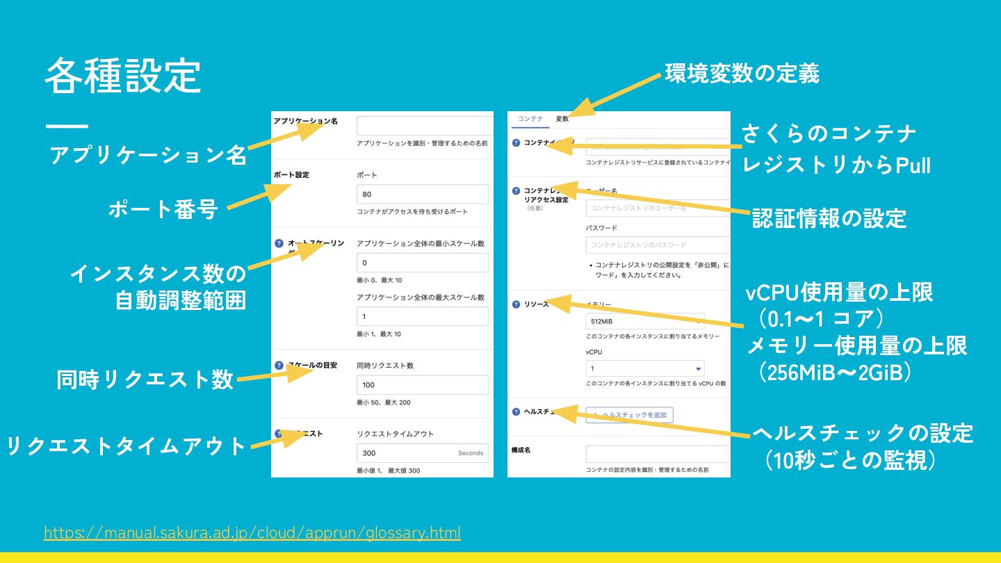 ポート番号 ヘルスチェックの設定 (10秒ごとの監視) 環境変数の定義 インスタンス数の 自動調整範囲 同時リクエスト数 リクエストタイムアウト https://manual.sakura.ad.jp/cloud/apprun/glossary.html
