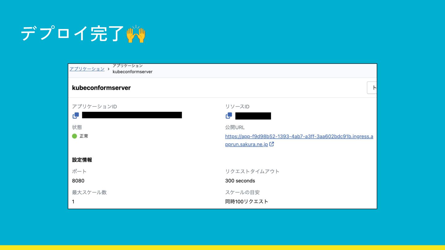 -f Dockerfile -t kubeconformserver.sakuracr.jp/kubeconformserver:latest . # sakuracr.jpにpushする docker push kubeconformserver.sakuracr.jp/kubeconformserver:latest