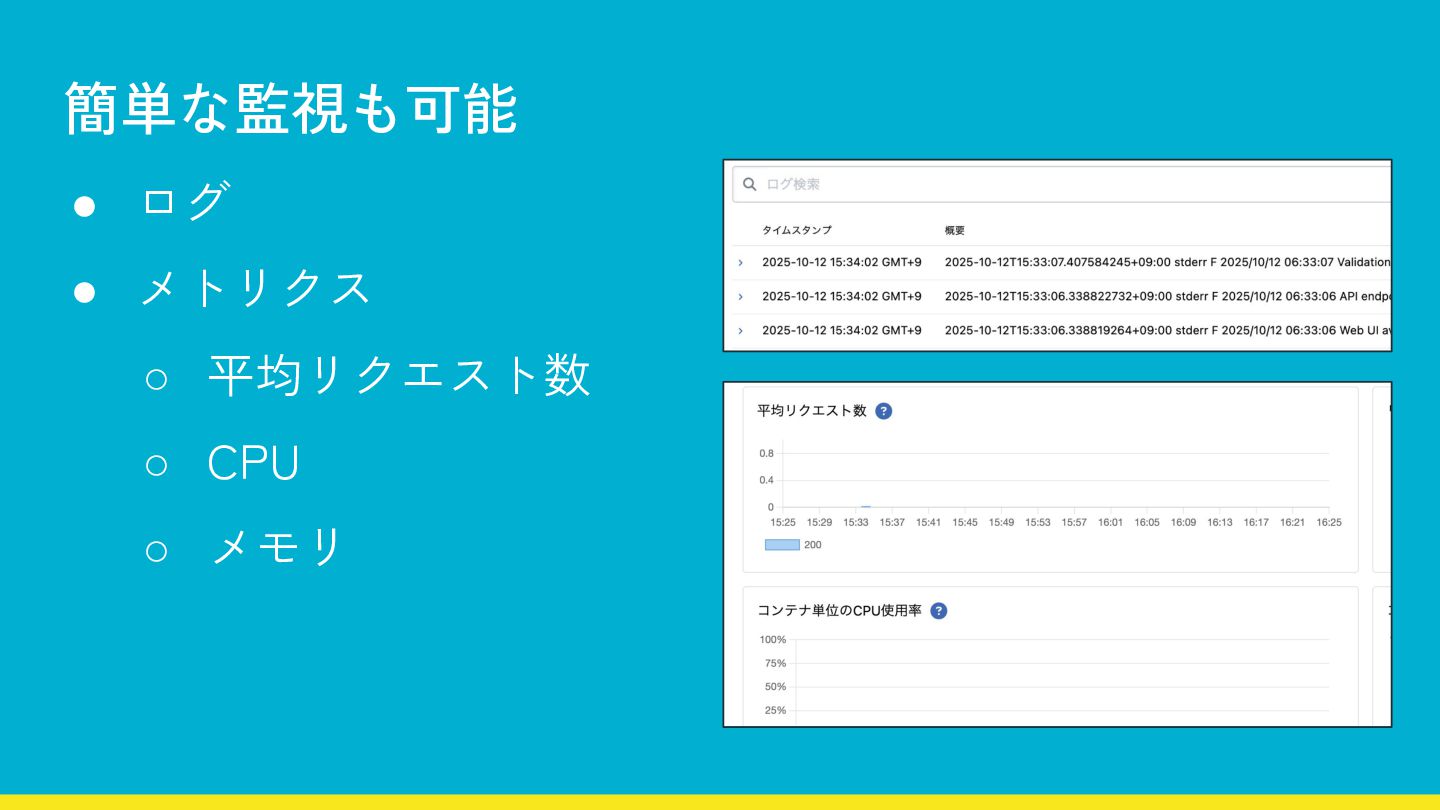 • ログ • メトリクス ◦ 平均リクエスト数 ◦ CPU ◦ メモリ
