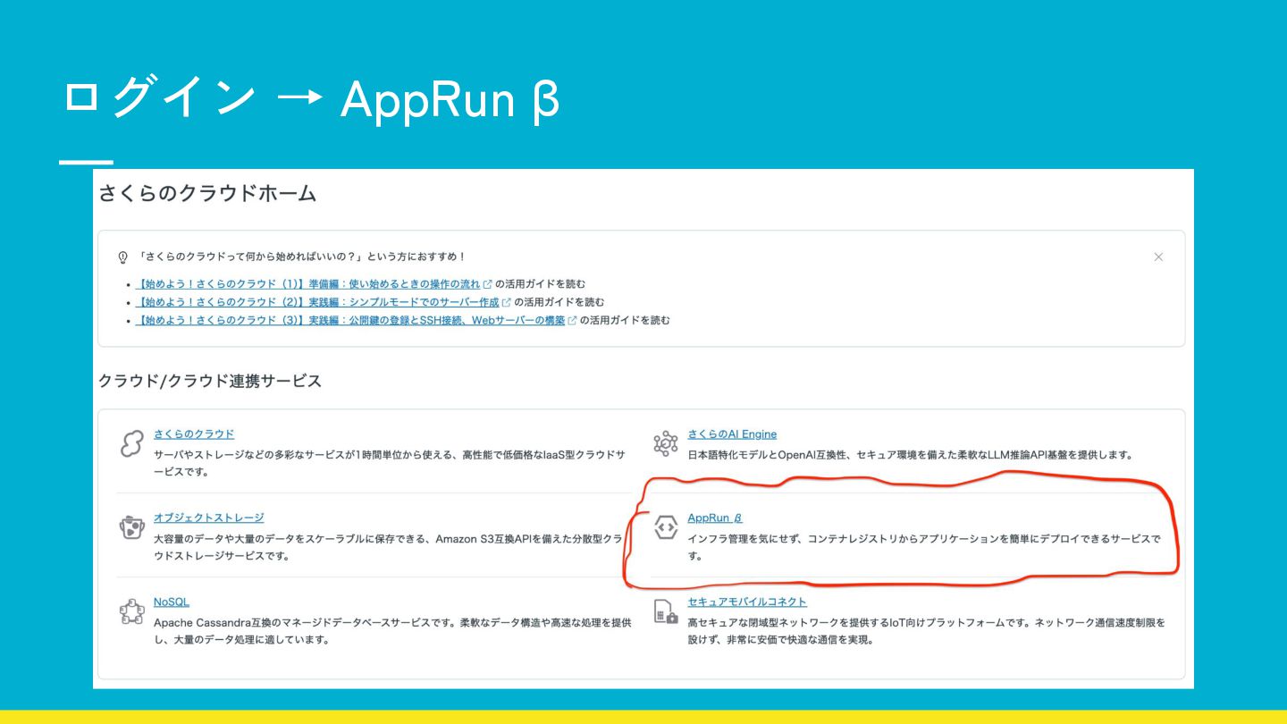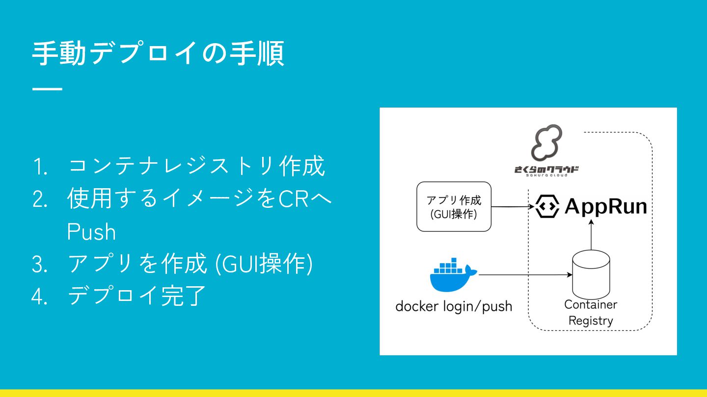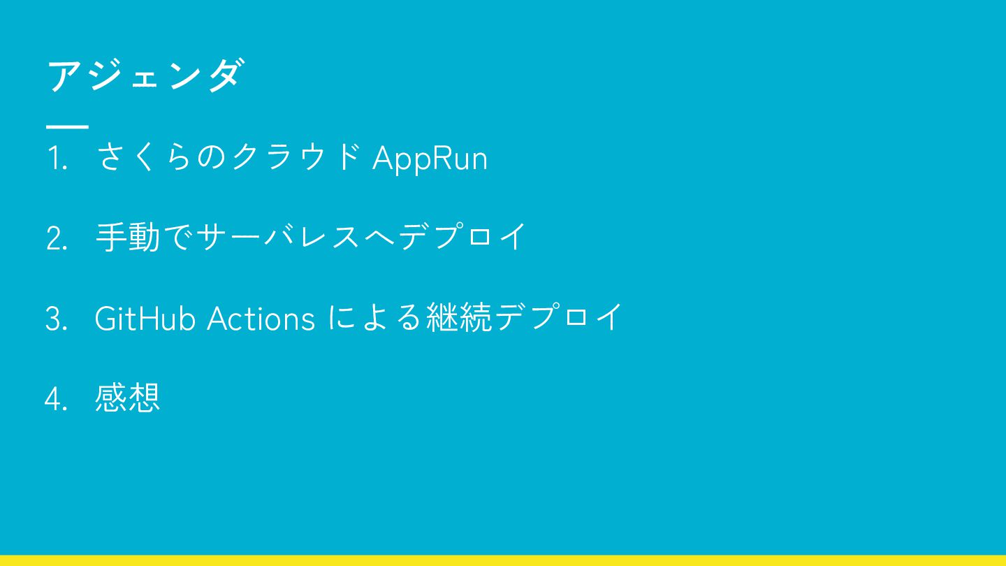 1. さくらのクラウド AppRun 2. 手動でサーバレスへデプロイ 3. GitHub Actions による継続デプロイ 4.