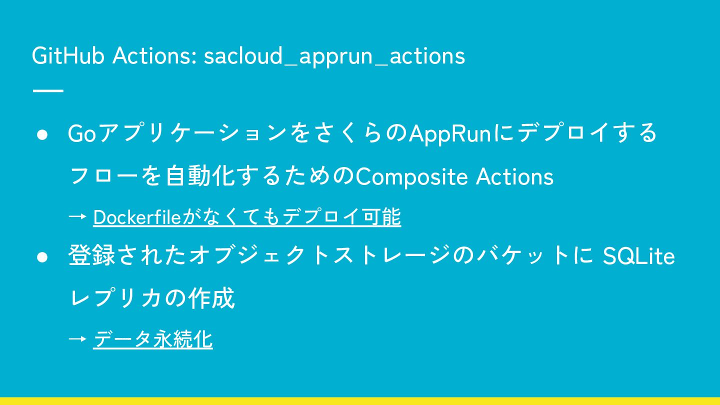 • GoアプリケーションをさくらのAppRunにデプロイする フローを自動化するためのComposite Actions → Dockerfileがなくてもデプロイ可能 • 登録されたオブジェクトストレージのバケットに SQLite レプリカの作成