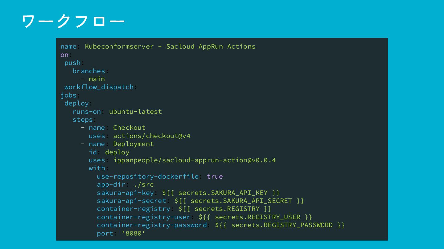 ワークフロー name: Kubeconformserver - Sacloud AppRun Actions on: push: branches: