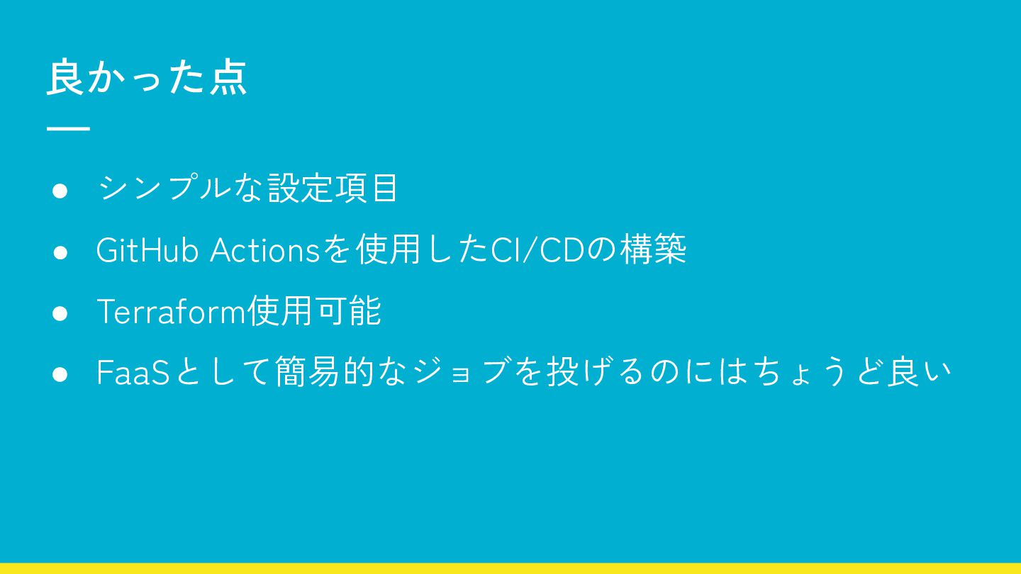 良かった点 • シンプルな設定項目 • GitHub Actionsを使用したCI/CDの構築 • Terraform使用可能 • FaaSとして簡易的なジョブを投げるのにはちょうど良い