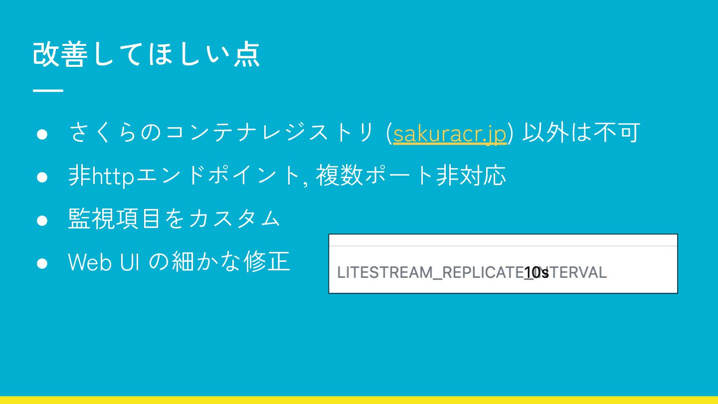 改善してほしい点 • さくらのコンテナレジストリ (sakuracr.jp) 以外は不可 • 非httpエンドポイント, 複数ポート非対応 • 監視項目をカスタム