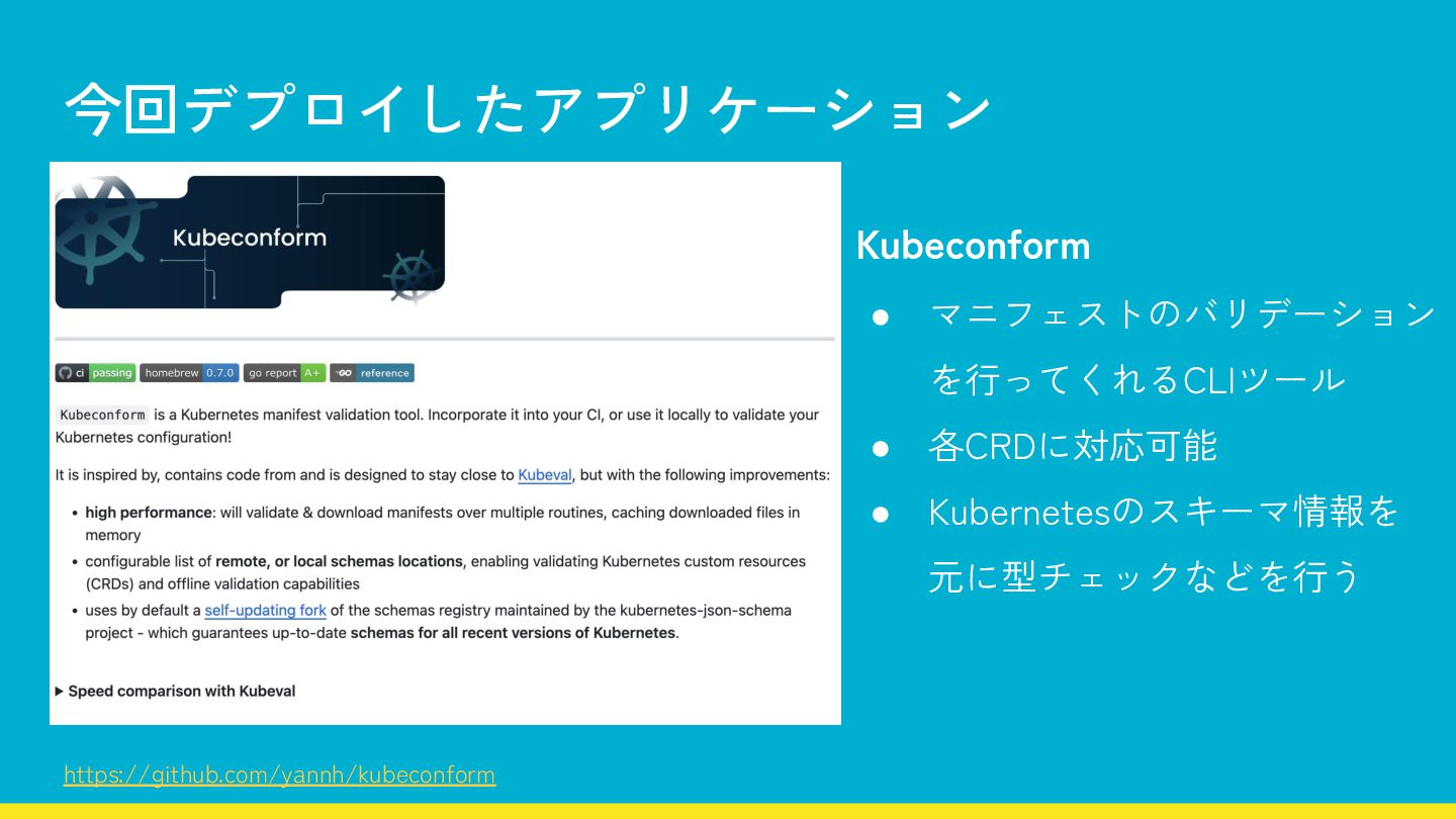 今回デプロイしたアプリケーション https://github.com/yannh/kubeconform Kubeconform • マニフェストのバリデーション を行ってくれるCLIツール • 各CRDに対応可能 • Kubernetesのスキーマ情報を
