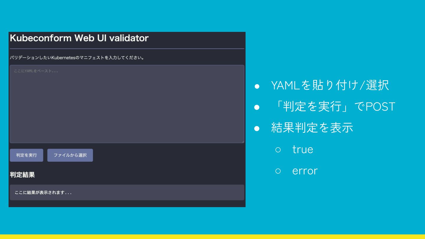 • YAMLを貼り付け/選択 • 「判定を実行」でPOST • 結果判定を表示 ◦ true ◦ error