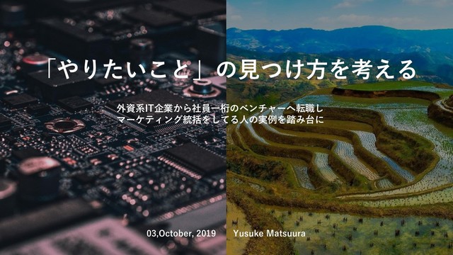 外資系IT企業から社員一桁のベンチャーへ転職し マーケティング統括をしてる人の実例を踏み台に 03,October, 2019 Yusuke Matsuura 「やりたいこと」の見つけ方を考える