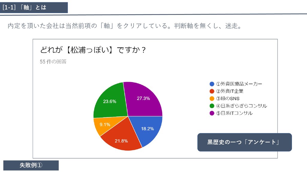 [1-1] 「軸」とは 内定を頂いた会社は当然前項の「軸」をクリアしている。判断軸を無くし、迷走。 黒歴史の一つ「アンケート」 失敗例①