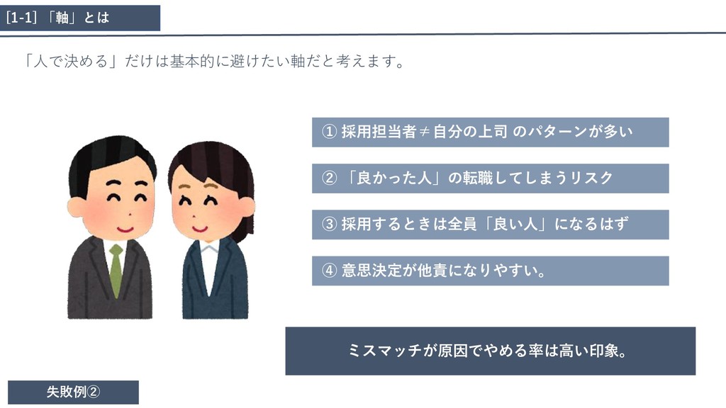 [1-1] 「軸」とは 「人で決める」だけは基本的に避けたい軸だと考えます。 ① 採用担当者≠自分の上司 のパターンが多い ② 「良かった人」の転職してしまうリスク ③ 採用するときは全員「良い人」になるはず
