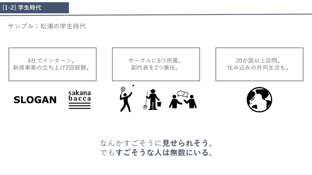 [1-2] 学生時代 サンプル:松浦の学生時代 4社でインターン。 新規事業の立ち上げ2回経験。 サークルに6つ所属。 副代表を2つ兼任。 20か国以上訪問。 住み込みの共同生活も。 なんかすごそうに見せられそう。