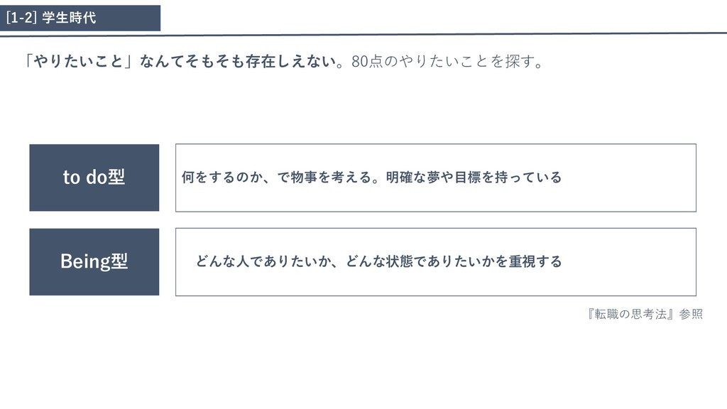 [1-2] 学生時代 「やりたいこと」なんてそもそも存在しえない。80点のやりたいことを探す。 何をするのか、で物事を考える。明確な夢や目標を持っている to do型 どんな人でありたいか、どんな状態でありたいかを重視する Being型 『転職の思考法』参照