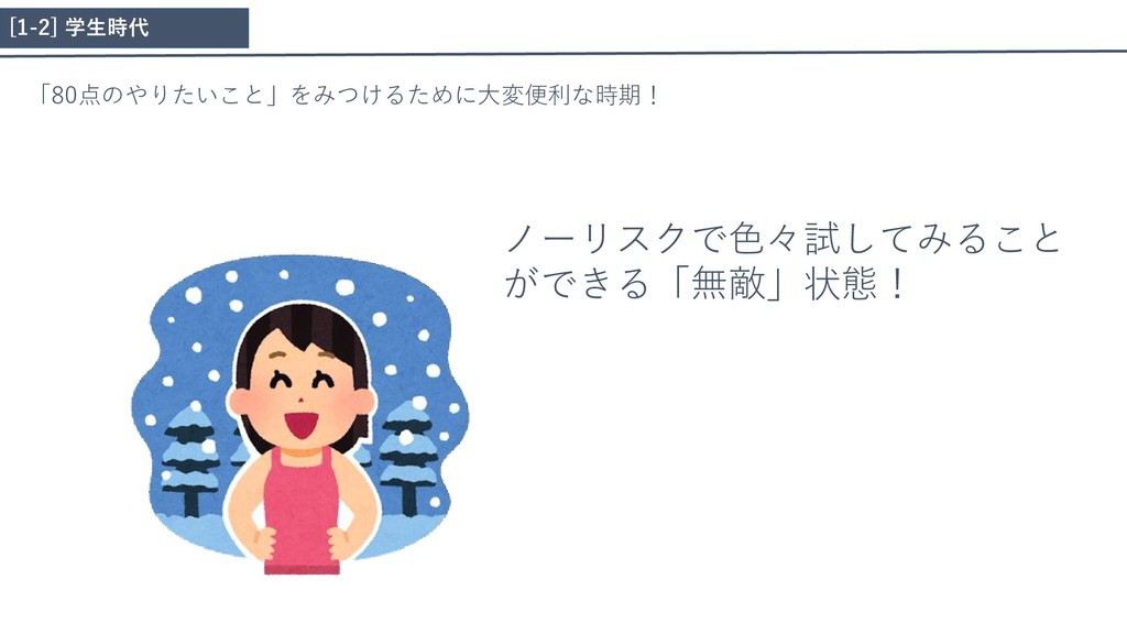 [1-2] 学生時代 「80点のやりたいこと」をみつけるために大変便利な時期! ノーリスクで色々試してみること ができる「無敵」状態!