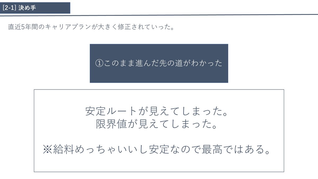 [2-1] 決め手 直近5年間のキャリアプランが大きく修正されていった。 ①このまま進んだ先の道がわかった 外資⇔日系問わず、 結局IT業界の中で ぐるぐる回っていくだけ。 給料ロンダリングの世界。 入社してから業界の実像が見えた。 人材流動性の低さ