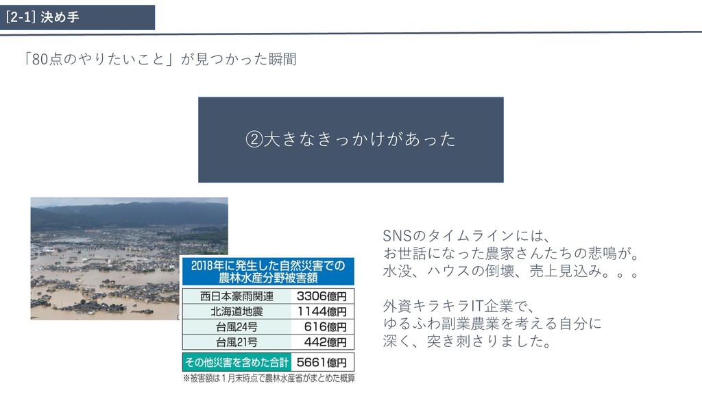 [2-1] 決め手 「80点のやりたいこと」が見つかった瞬間 SNSのタイムラインには、 お世話になった農家さんたちの悲鳴が。 水没、ハウスの倒壊、売上見込み。。。 外資キラキラIT企業で、 ゆるふわ副業農業を考える自分に 深く、突き刺さりました。 ②大きなきっかけがあった