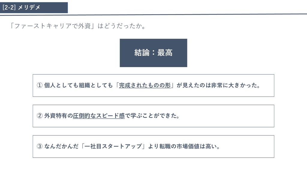 [2-2] メリデメ 「ファーストキャリアで外資」はどうだったか。 結論:最高 ① 個人としても組織としても「完成されたものの形」が見えたのは非常に大きかった。 ② 外資特有の圧倒的なスピード感で学ぶことができた。 ③ なんだかんだ「一社目スタートアップ」より転職の市場価値は高い。
