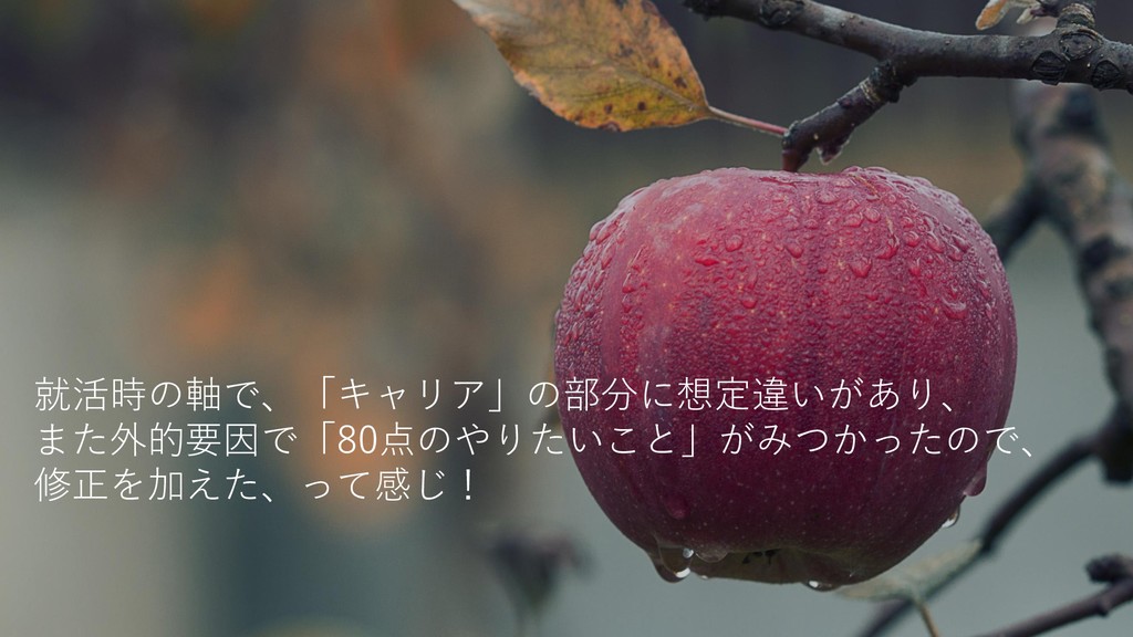 就活時の軸で、「キャリア」の部分に想定違いがあり、 また外的要因で「80点のやりたいこと」がみつかったので、 修正を加えた、って感じ!