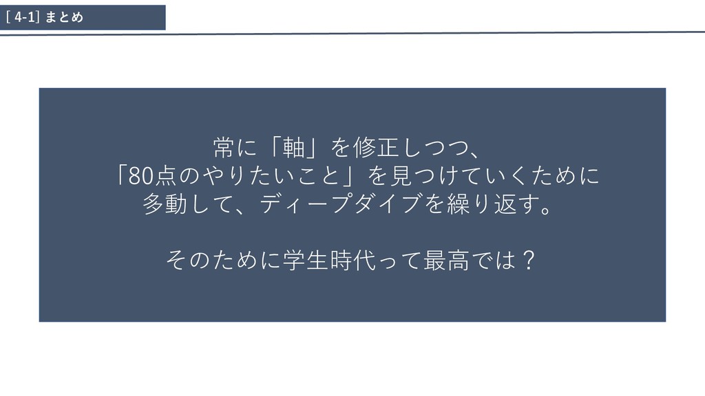 [ 4-1] まとめ 常に「軸」を修正しつつ、 「80点のやりたいこと」を見つけていくために 多動して、ディープダイブを繰り返す。 そのために学生時代って最高では?
